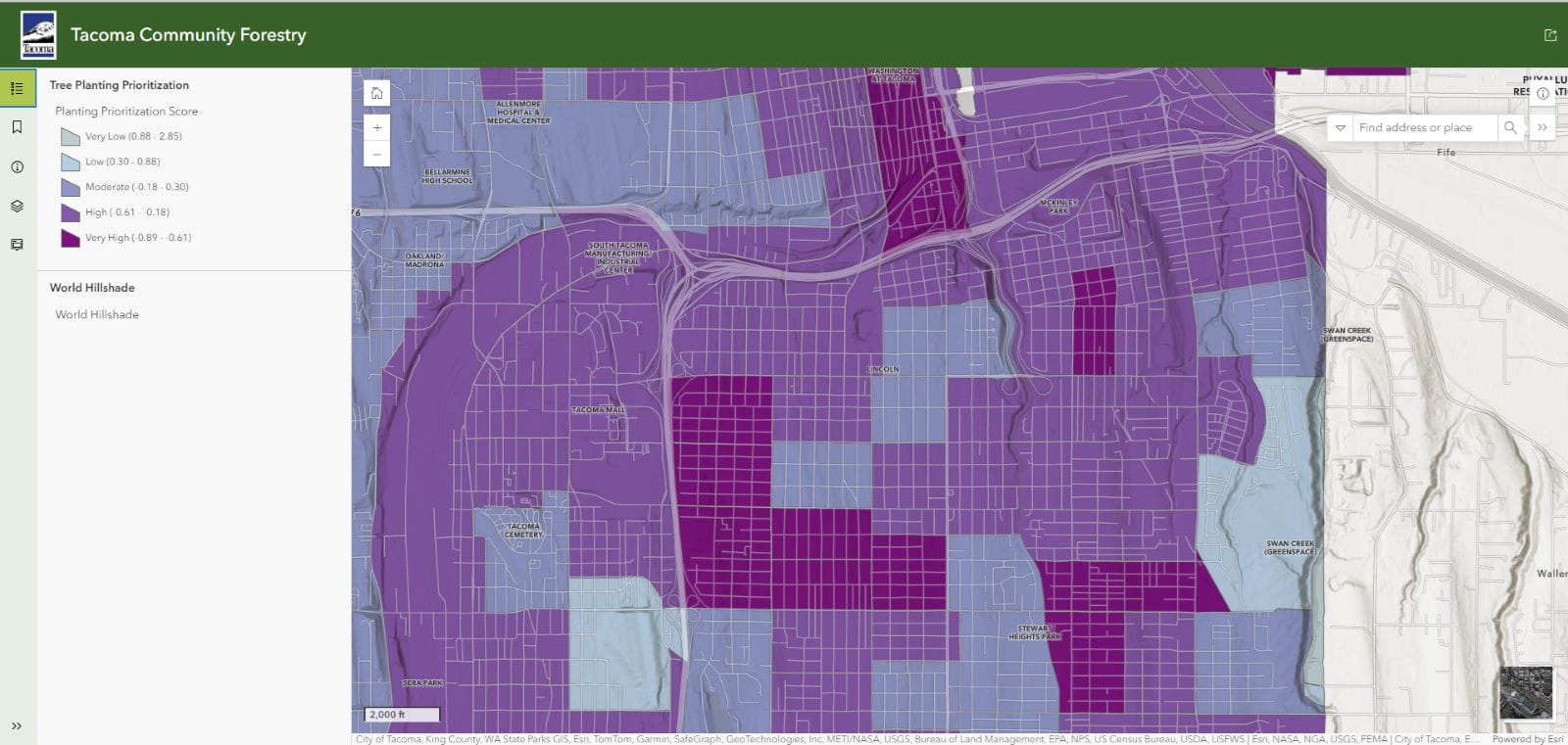 Tacoma’s current tree canopy covers less than 20% of the city, the lowest among Puget Sound cities allowing concrete and structures throughout the city to absorb and radiate heat unobstructed.