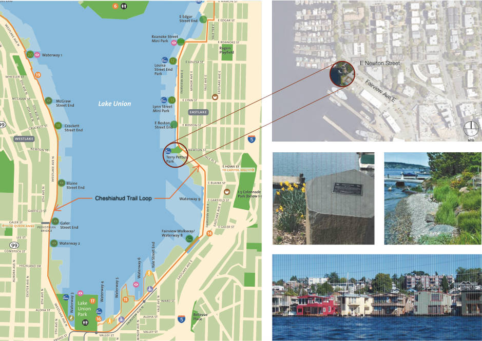 Terry Pettus Park in Eastlake will bring a public plaza, picnic area, green stormwater infrastructure, and habitat restoration with native plants on a Lake Union street end site currently equipped with benches and a dock.
