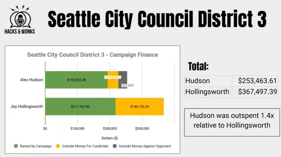 After electing a socialist in two straight elections plus a recall, District 3 seemed like safe terrain for progressives to hold. But then something weird happened. First, centrists ran a strong candidate in Joy Hollingsworth, who had major appeal in the Central District, where her family has deep ties going back generations. Progressives thought they had a fairly strong candidate to go toe-to-toe in Alex Hudson, but a few key blunders proved decisive, leading to a six-point loss.