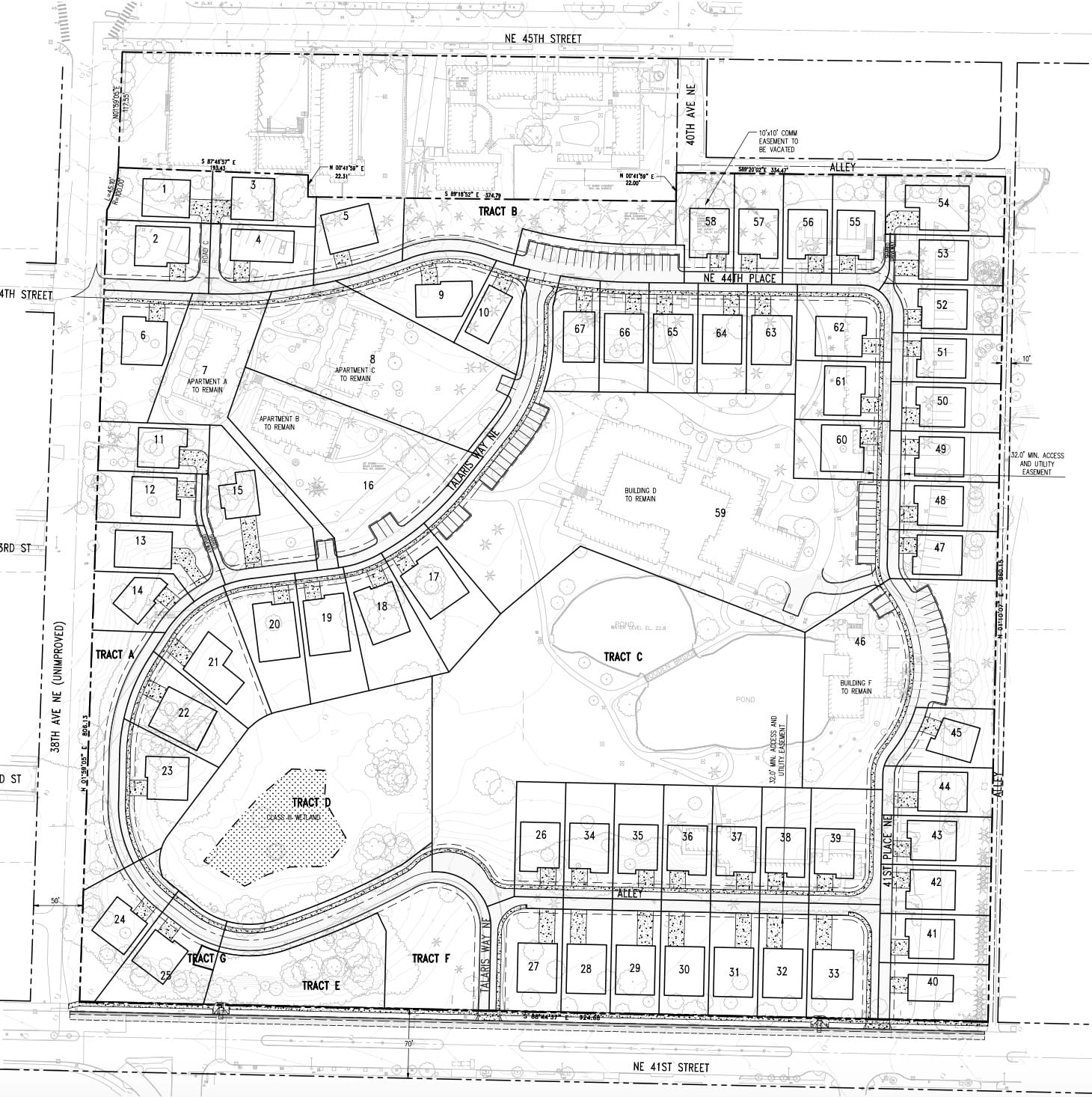 Lot 59 is proposed to stretch between the two private roads on the site, then go up and connect to the third. The bulk of the lot cuts in and out to wrap around neighboring private lots. Then it stretches 140 feet north to a secondary parking lot. The long stem takes up the whole width of Talaris way before connecting to the parking lot that scoops chunks out of Tract B and Lot 58.
