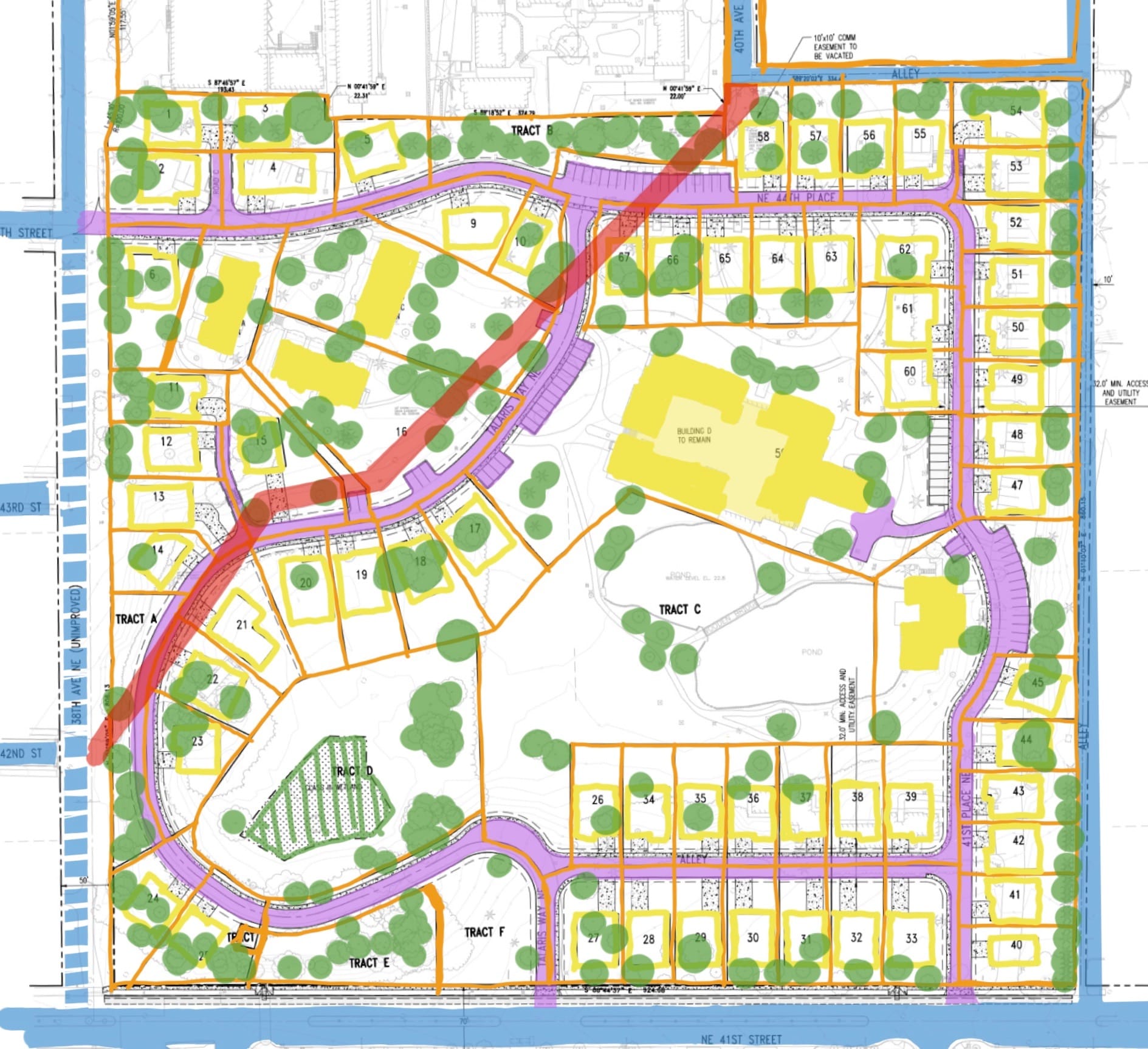 Using color, we can build up an understanding of what’s happening on the site. Let’s start in the northwest corner at the top left. It’s the main entrance from Sand Point Way via 38th Avenue NE. The boldest black lines labeled with directions are property lines. Let’s start there and build up colors. Orange for property lines. Yellow for house sites. Blue for roads. Like so: