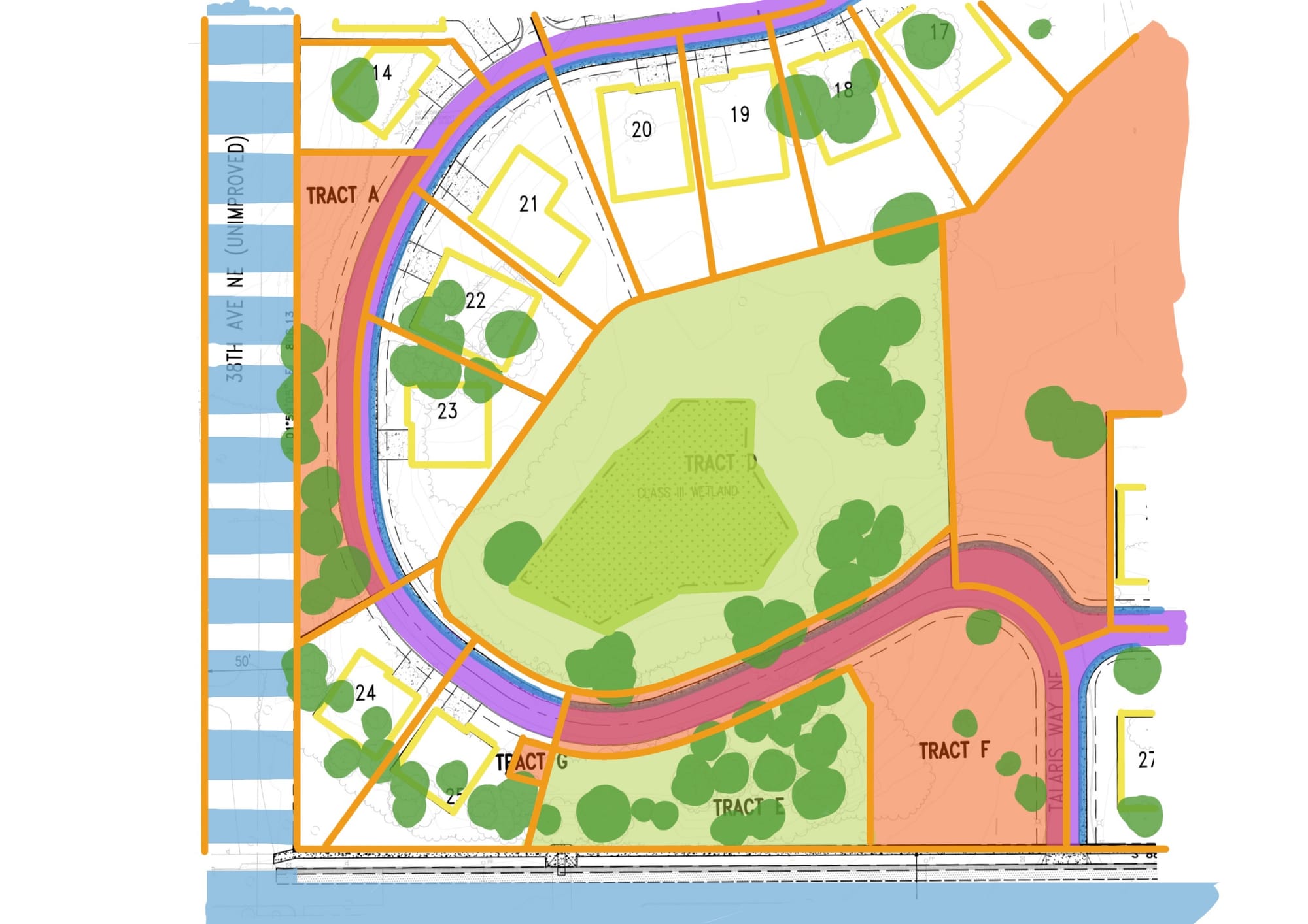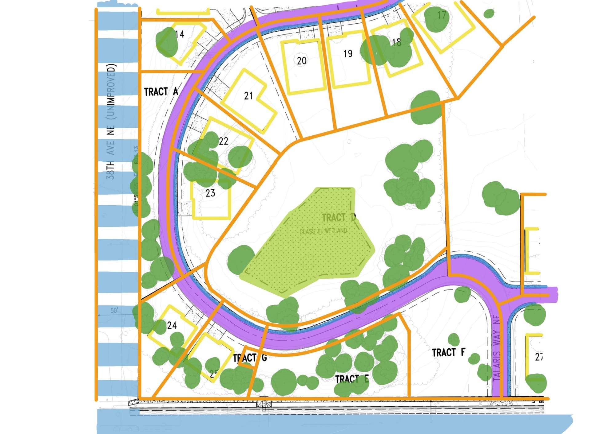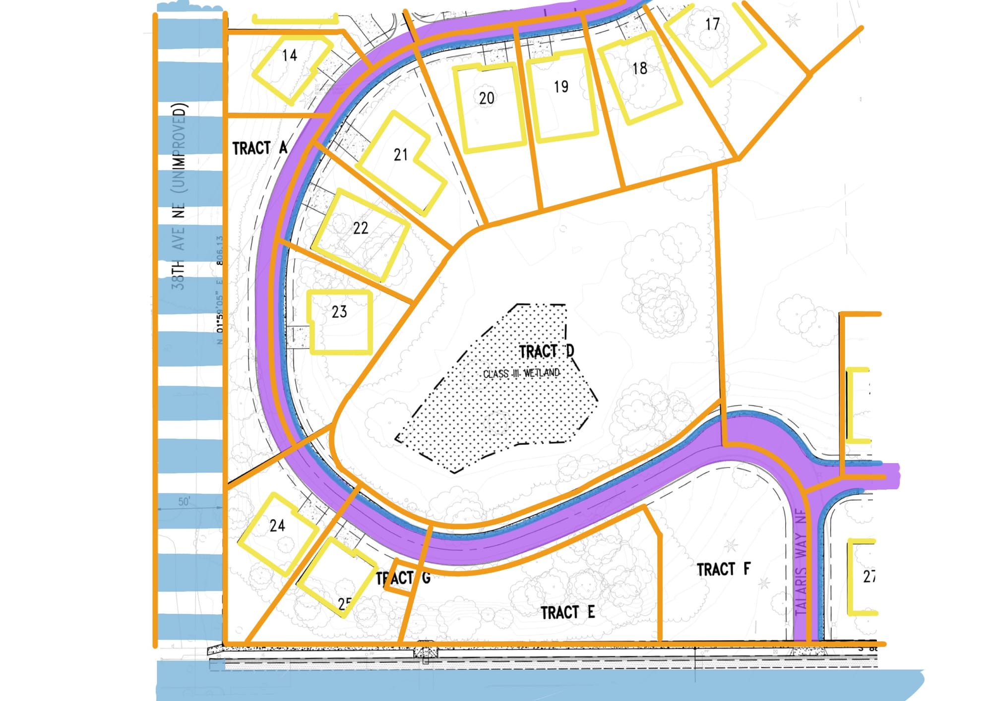 What it effectively does is strangle Tract A. To avoid the paper street, the applicants have slalomed the proposed private street between a couple more lots and the edges of the property line. The proposed Talaris Way comes within its own width of the edge of property, leaving a tiny crop of trees on Tract A that have little more environmental use than the dead basil on my windowsill.
