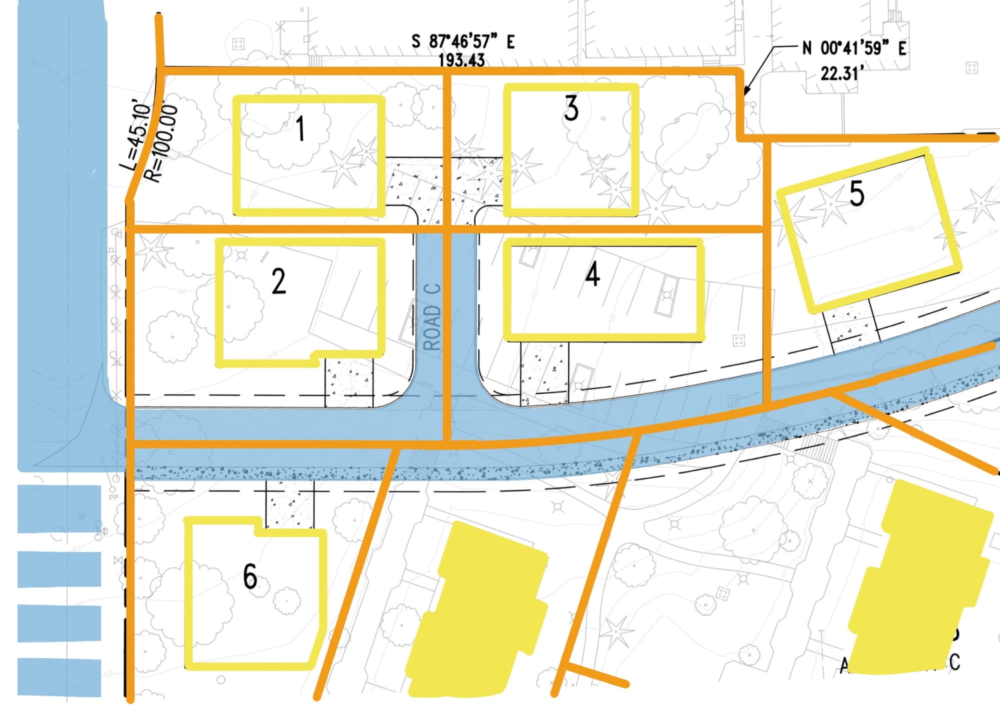 In the southwest corner of the site are HOA parcels and a few lots. Let’s work through highlighting them and see what we can find. Orange property lines, yellow building areas, shades of blue for the public streets and private street easements.