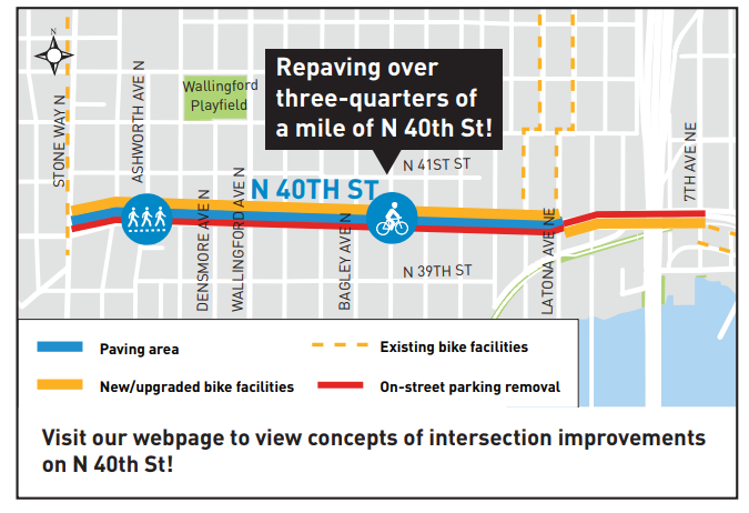 Late last year, SDOT announced it was “stepping back” from plans to install protected bicycle facilities on N 40th St in Wallingford as part of its planned repaving of the street “given concerns we heard from neighbors and businesses as well as from people who bike through the neighborhood.”
