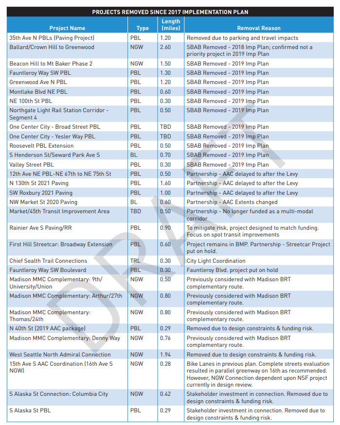 If the segment isn’t listed above, there isn’t funding to complete it. The BMP update includes a list of projects that have now dropped off the implementation plan, quite a few of which have been listed as “SBAB Removed”, referring to the Seattle Bicycle Advisory Board. The board was tasked with selecting projects like the ones above, but given the funding realities not all projects that they would have liked to select were able to make the list–listing the board as the reason for their removal from the plan is an odd framing.