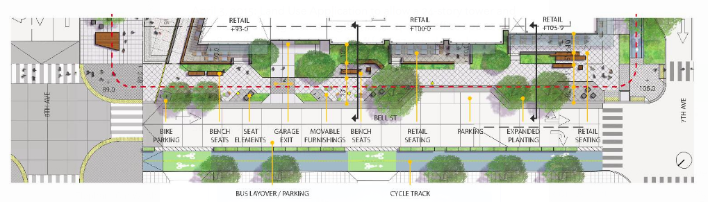 Between 5th Ave and Denny Way, a two-way cycletrack would be installed on the north side of the street, along with a continuation of the current green street treatment in place on the rest of Bell Street. The designs for this cycletrack can be seen in the plans for Amazon’s newest building under construction on Block 21, between 7th Ave and 8th Ave.