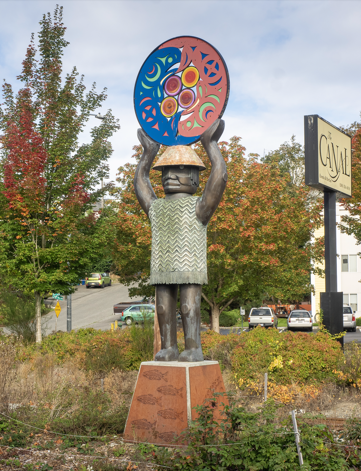 Views of the bridge and canal are afforded by a generous plaza with an interpretive sign, pavers, and a cantilevered overlook. The jewel of these improvements is the sculpture “A Salish Welcome”, which was created in 2010 by Marvin Oliver to welcome visitors to this location which has been valued by countless generations.