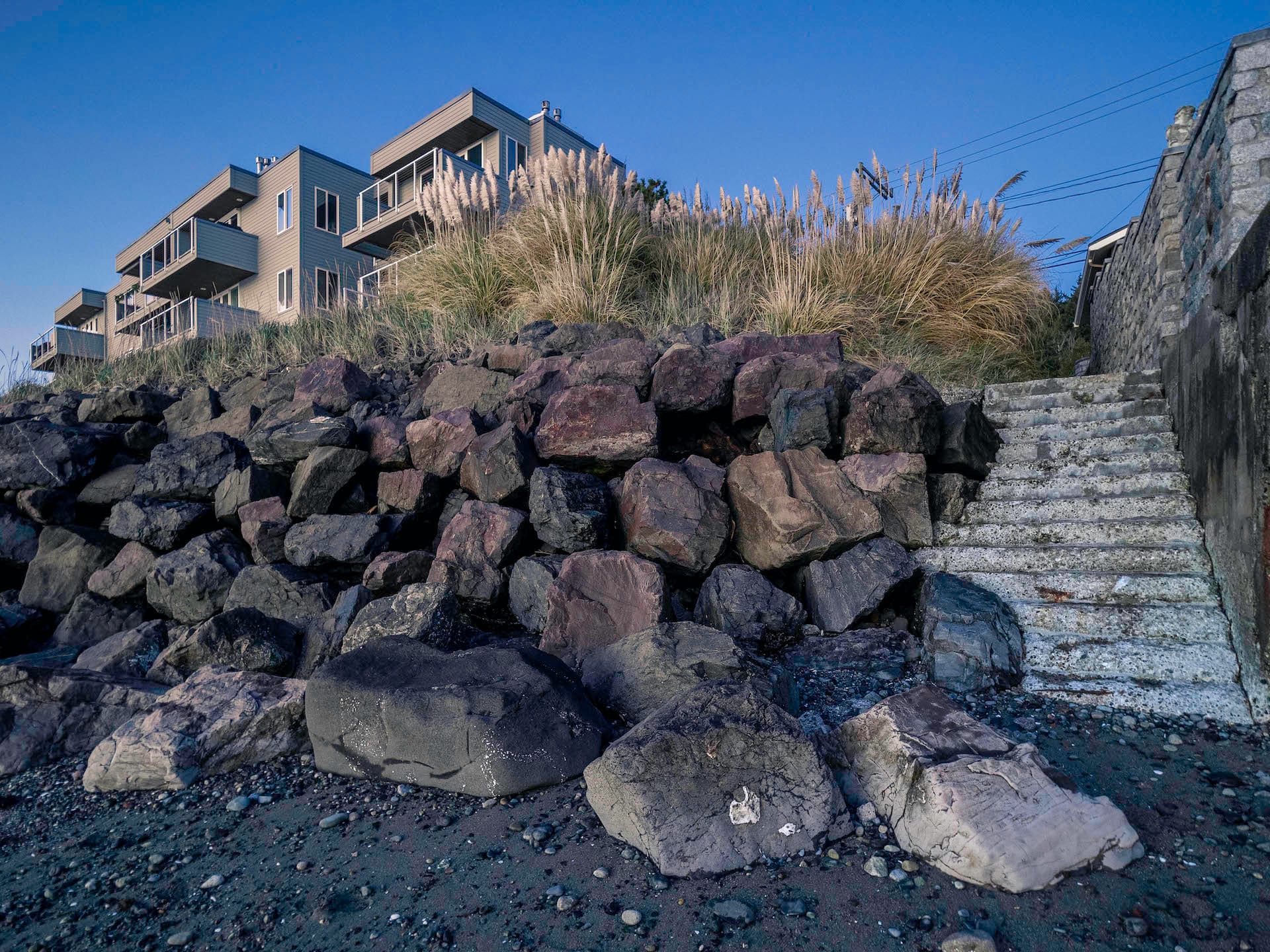 - An icon on West Seattle’s waterfront, the Harbor West Condominium’s numerous concrete piers are revealed at low tide. The stone breakwater in the foreground protects Harbor West and its neighbors along Beachside Drive from slipping back into the sea.