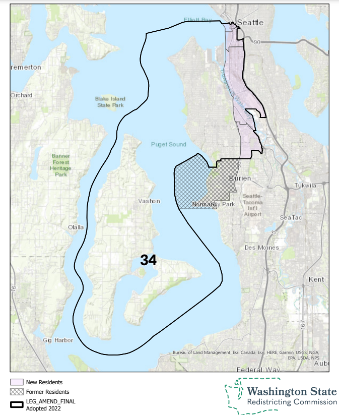 Geographically, the 34th remains very similar following 2022 redistricting and is still centered around West Seattle, with Vashon Island and White Center also in its orbit. However, it did lose a chunk of Burien and its small slice of Normandy Park to the 33rd, and in their place pick up Pioneer Square, SoDo, South Park, and a swath of the Duwamish Valley. It’s likely to remain a progressive stronghold given those boundaries.