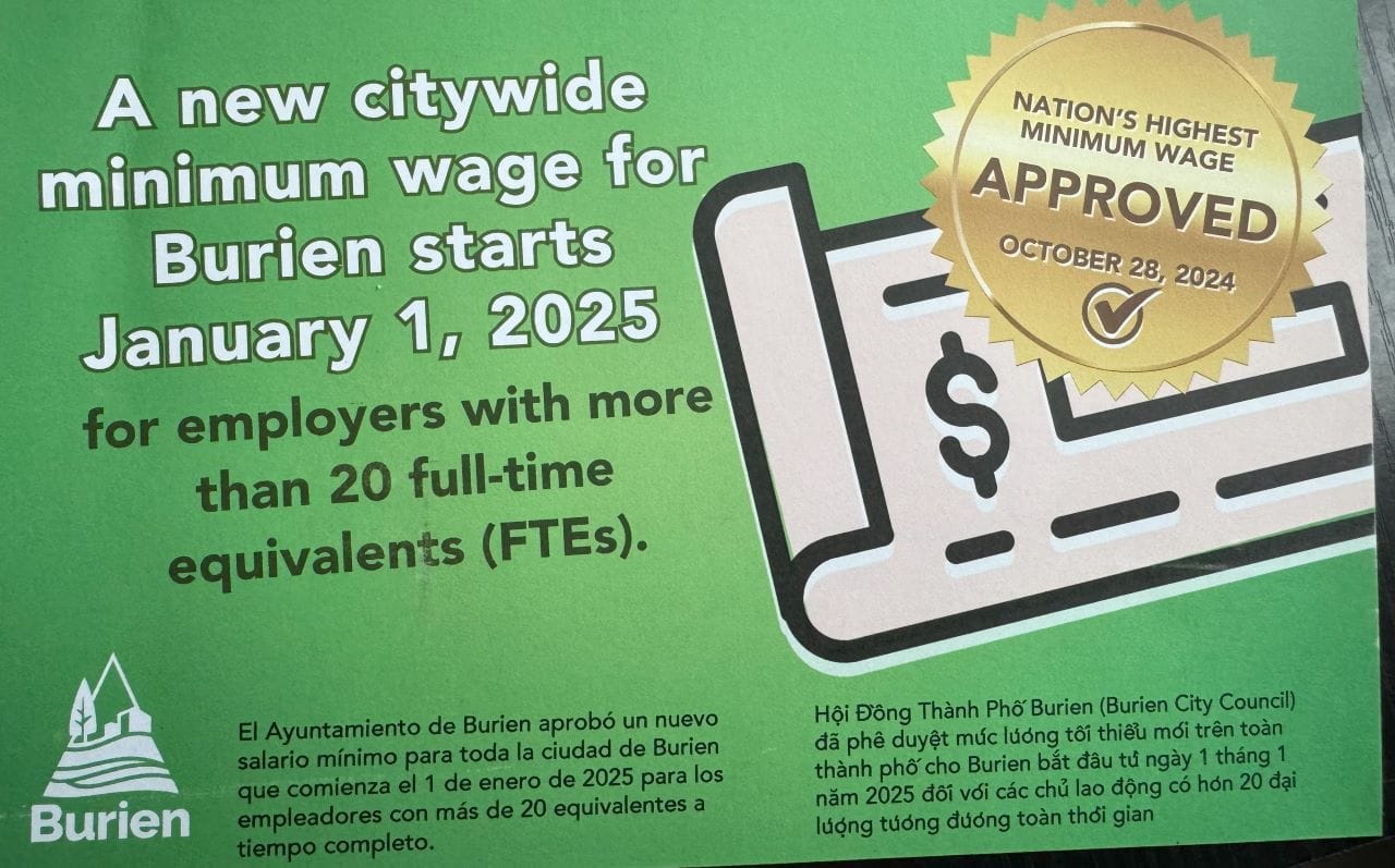 In October 2024, Burien’s council passed Ordinance 855 to grant workers a $4.50 increase over state minimum wage, but did so only for employers with 500 or more full-time employees in King County. The minimum wage at employers with between 20 and 499 full-time employees would increase by $3.50 over the state minimum, and employers with fewer than 20 full-time employees would be completely exempt.