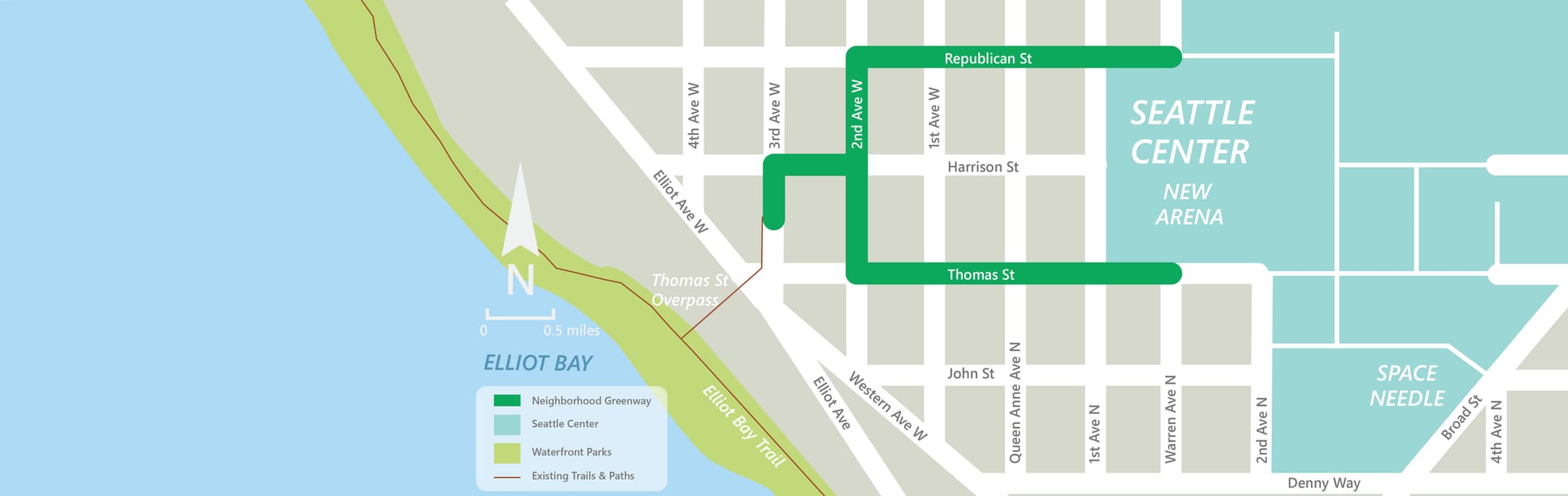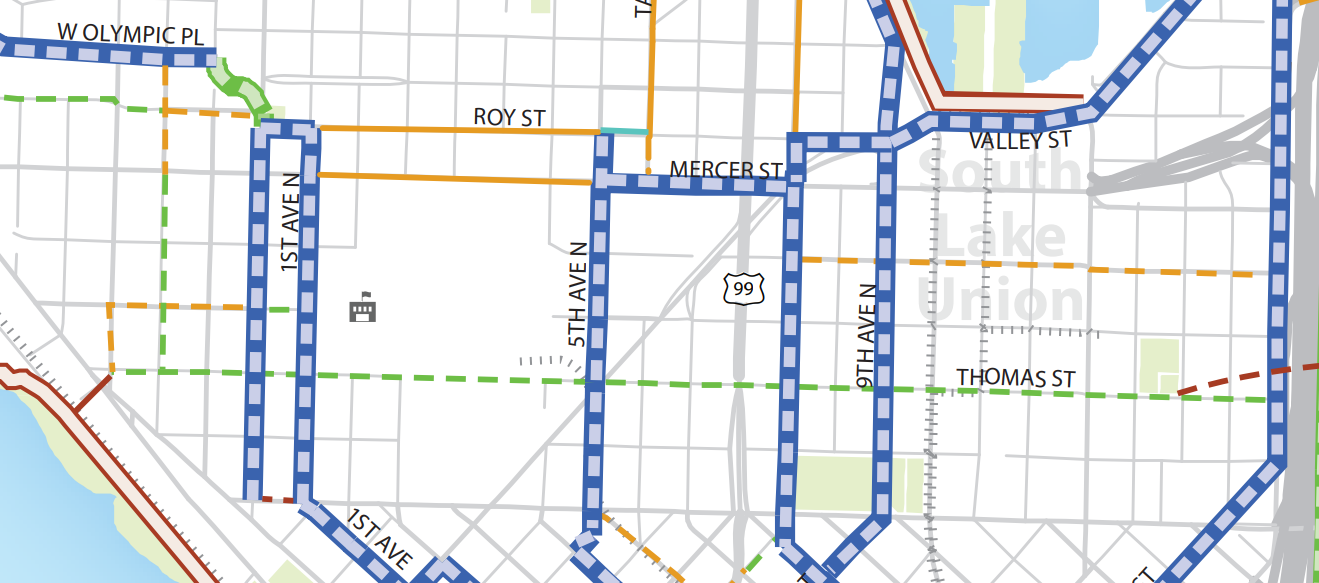 Thomas Street is envisioned in the bicycle master plan as connecting all the way from Elliott Ave and its connection to the Elliott Bay Trail to I-5 and possibly beyond. This segment is being accelerated to improve bicycle connections to Seattle Center in advance of the arena renovation.