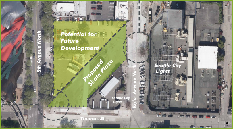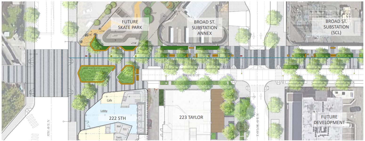 The traffic diverter at 5th Avenue N would become public space under the longer-term street concept plan. Seattle City Light is planning on utilizing a portion of its 1% for arts fund to improve the streetscape in front of its Broad Street substation on Thomas Street, adjacent to where the Seattle Center skate park is planning to relocate to, on the former Broad Street itself, now vacated. The interim public space planned on Thomas for this year would ultimately become an extension of Seattle Center, where vehicle traffic would be restricted but where people walking, biking, and rolling would enter and exit Seattle Center itself.