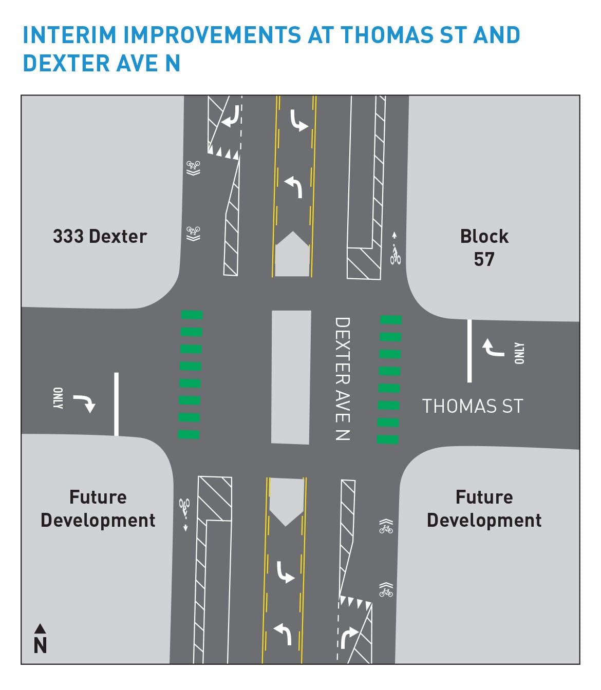 At Dexter Ave N, by the end of the year another traffic diverter will be installed, restricting vehicles from going straight across Dexter from either direction of Thomas Street and banning left turns from Dexter onto Thomas. This will also be a big safety improvement for people biking, walking and rolling on Dexter.