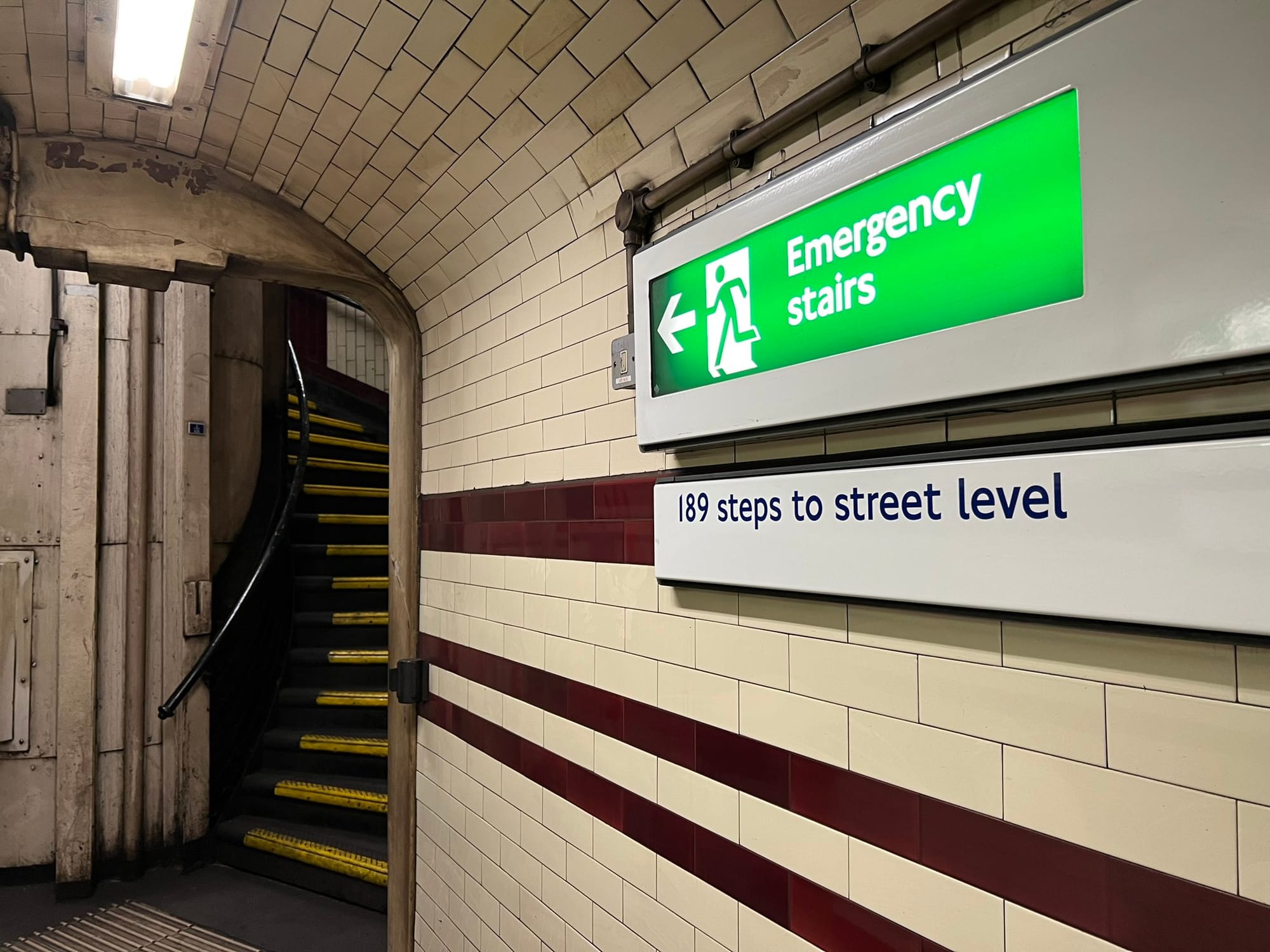 One tool that London has occasionally employed is stair count signs. At the Belsize Park Tube station, stairs to the surface have wall signs letting riders how many steps there are between station platforms and the surface. The station is relatively deep at 109 feet below the surface. Riders have two choices: the stairs or an elevator and 20 steps. It’s not a wheelchair accessible station as a result, but without the notice, riders who may be unfamiliar with the station wouldn’t necessarily know what their options are and if the stairs are a wise choice for them.