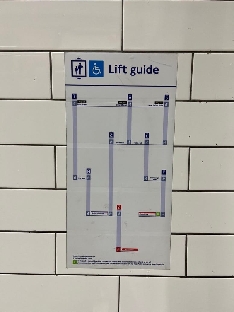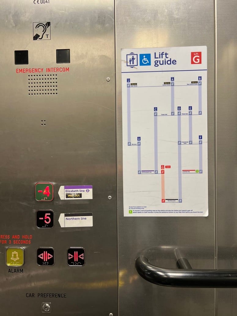 Another ingenuity in London: elevator network guides. At many stations, all elevators are given a unique number or letter emblazoned above their thresholds. Along with these are placard guides placed to the side and inside of elevators diagraming the relationship of elevators throughout a station or station complex. Those diagrams can be quite detailed, offering information on which floors elevators connect and which side the elevator doors will open.