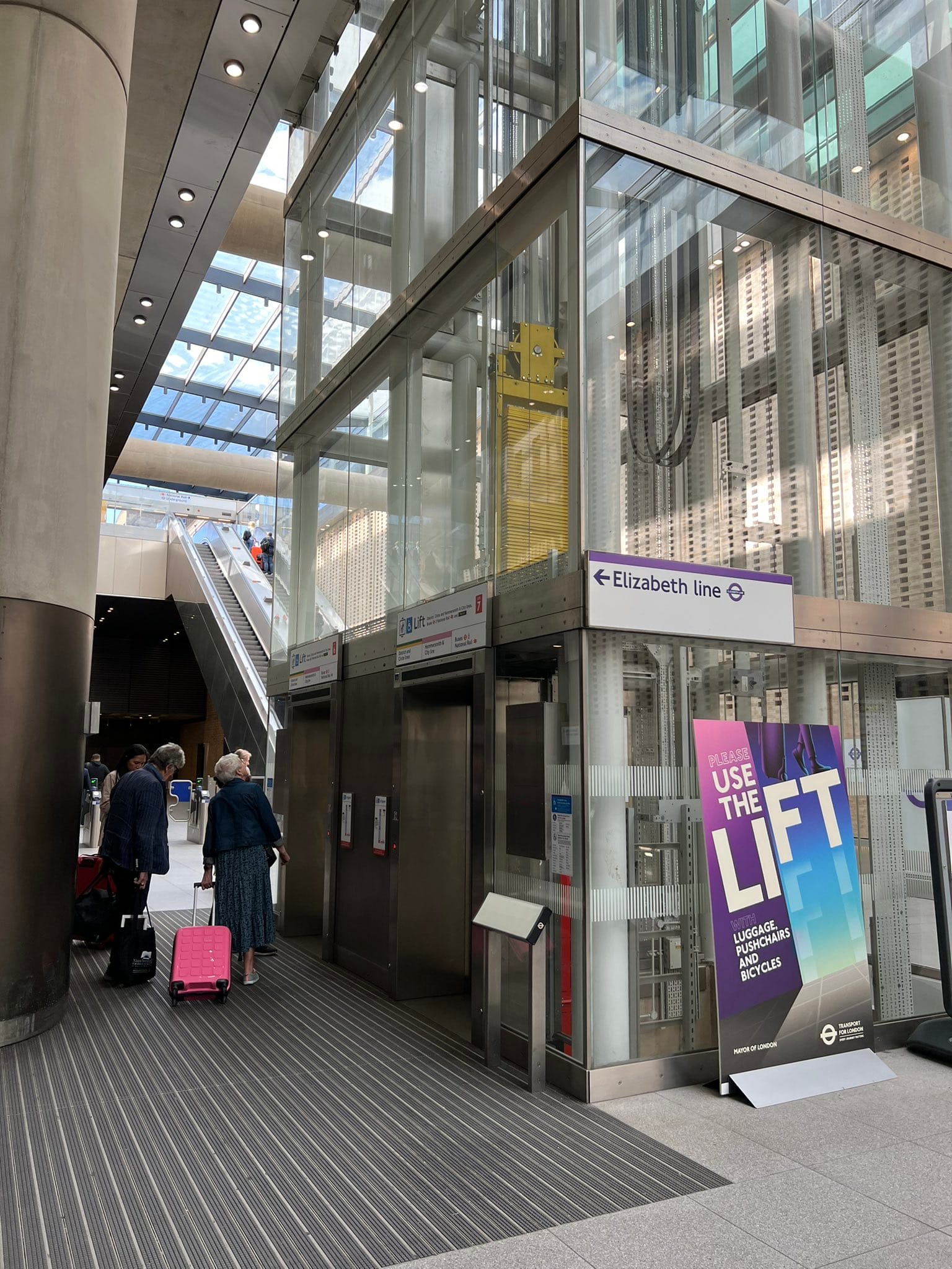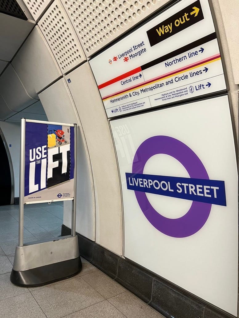 Want to go from the Elizabeth line to one of the London Underground lines at Liverpool Street? Take Lift E to the mezzanine floor and then Lift F to the ticket hall. From there, additional guidance will be offered. In a more complex situation, a rider may want to reach Broadgate. The elevator guide would direct the rider to similarly take the same elevators to the ticket hall but then ride Lift G to the Broadgate level.