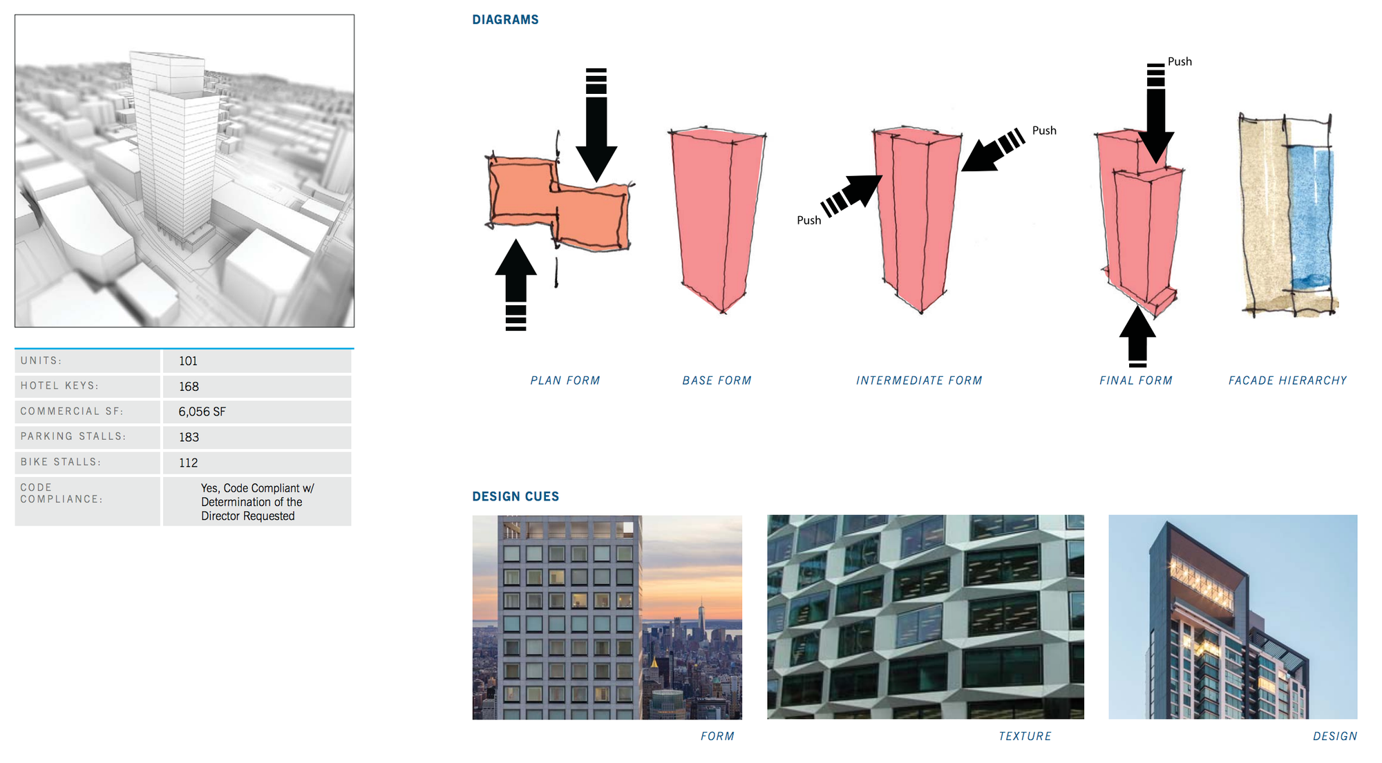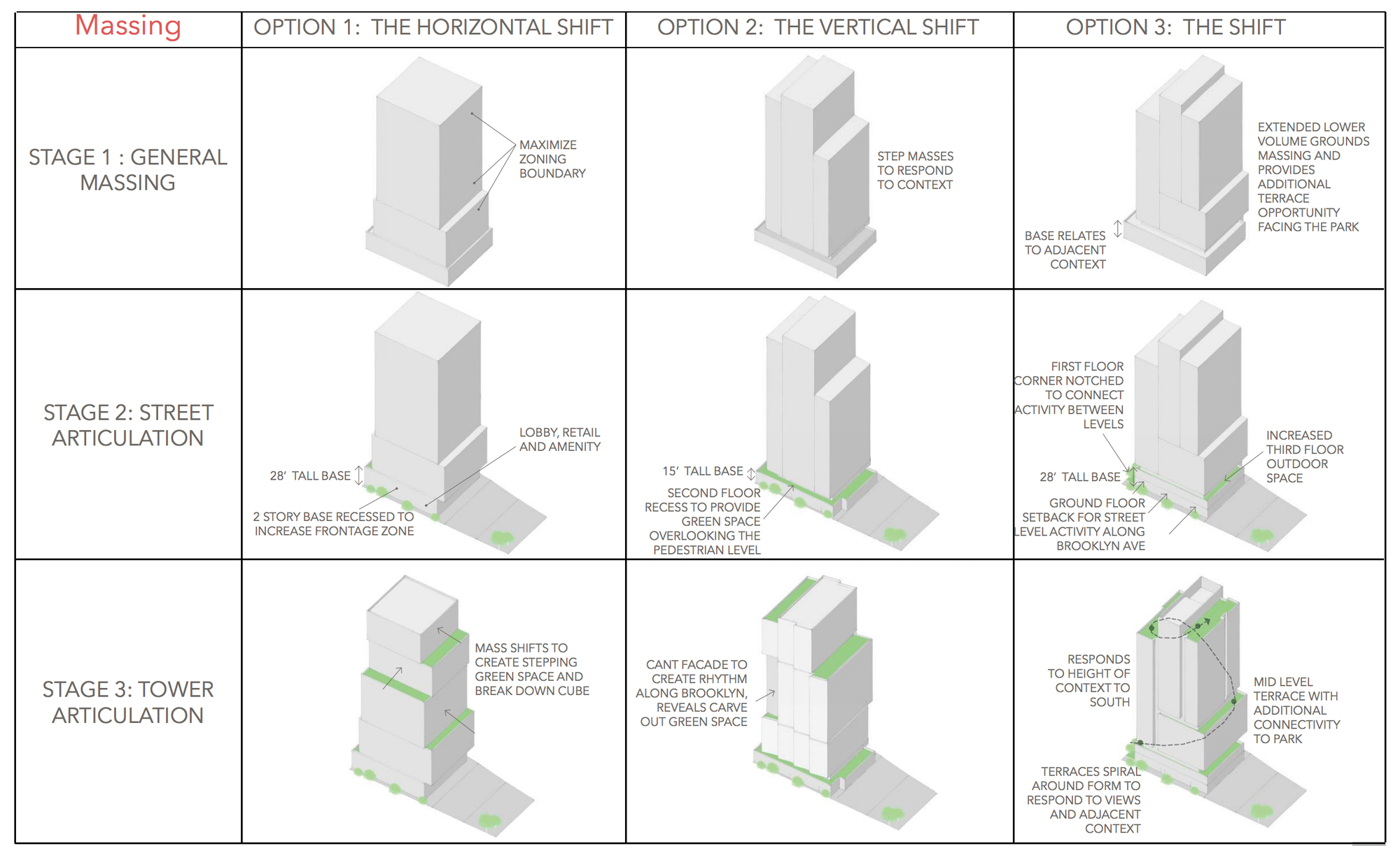 The design team presented three alternatives, each variations on shifted boxes. The project’s preferred alternative is called The Shift and the bulk of the building is broken down by pushing and pulling the building both vertically and horizontally and then further subdividing it through a series insets. The resulting form has multiple roof terraces. While I don’t love the overall mass, and may have chosen option A myself, the architecture firm seems competent–particularly on their larger, higher budget projects. Based on their portfolio and the precedent projects presented in their design review packet they appear as though they have the ability to make it into something nice.