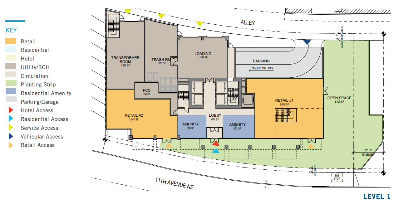 Like the first project, this building is relying on open space and streetscape dedications in addition to required MHA participation–likely upwards of $7 million based on preliminary gross square footage of 348,944–to reach it’s full building potential. In this case, though, the green space appears to be more closely tied to the base of the building. The pocket park will benefit from the additional activity provided by the resident and hotel guests as well and the retail.
