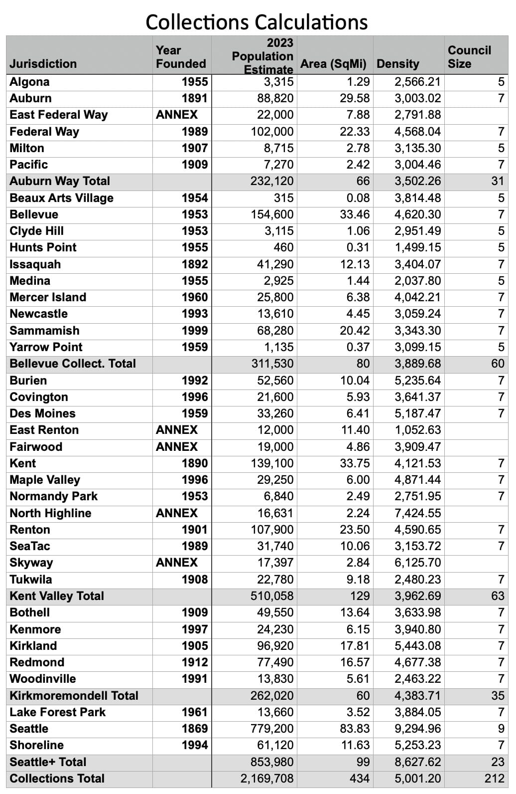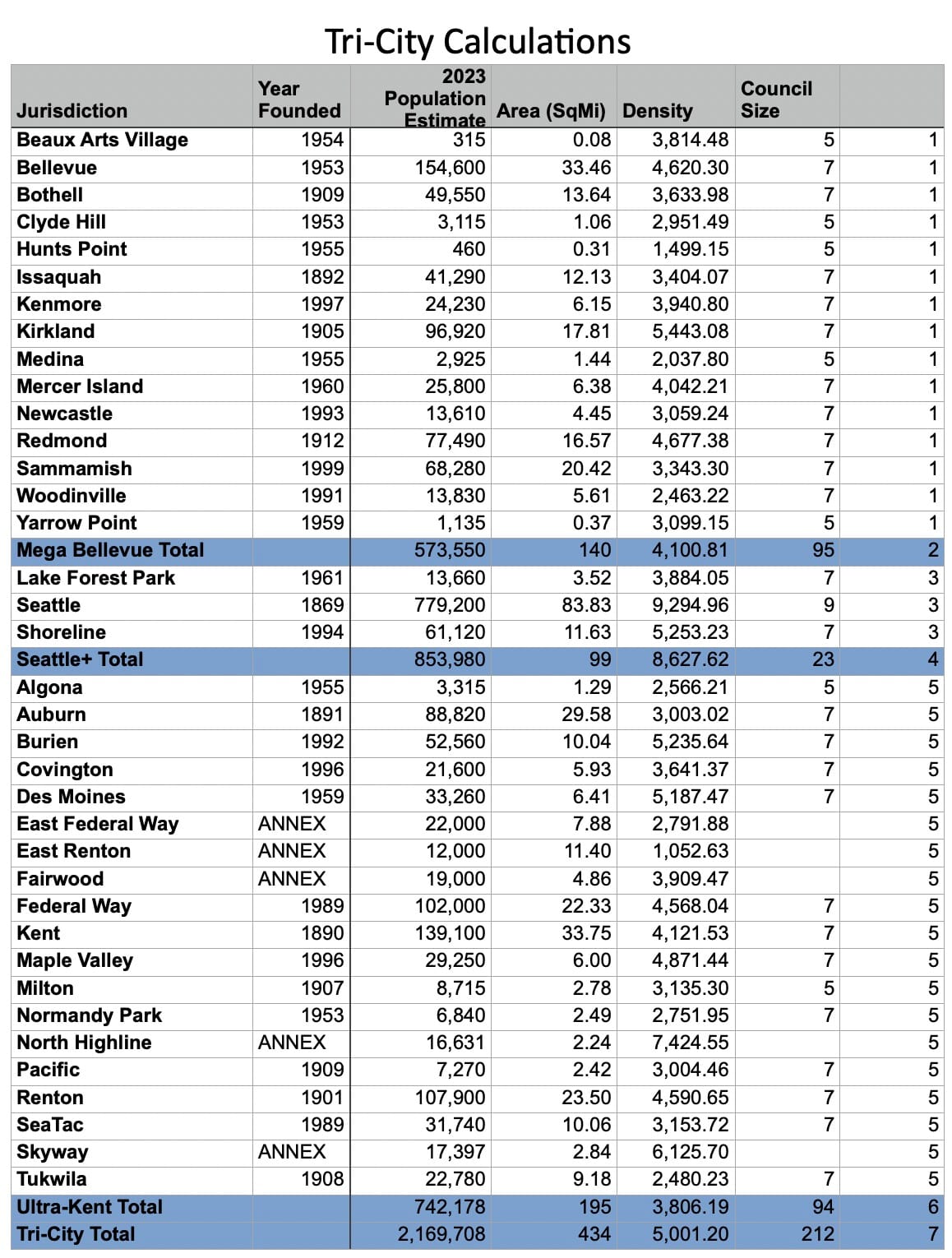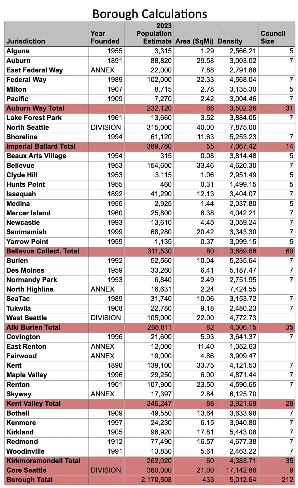 Jump back to top. Here are the basic caveats for the calculations used in this article. Population data, area, and density for established jurisdictions comes from the Washington Department of Commerce, Office of Financial Management April 1, 2023 population estimate. Six King County cities – Skykomish, Duvall, Carnation, Snoqualmie, North Ben, and Enumclaw – are omitted from the calculations though they are technically within the Urban Growth Boundary because they are separated by an air gap. Black Diamond was omitted, though it is attached to Maple Valley, because there are other plans for that in a column at a later date. Dates of incorporation come from History Link. Jurisdictions that cross the boundary of Snohomish or Pierce county are counted as a whole. Unincorporated area population estimates come from the most recent figures available from the US Census or the King County Annexation Area files. Population estimates and area for a divided Seattle come from the city’s Redistricting commission.
