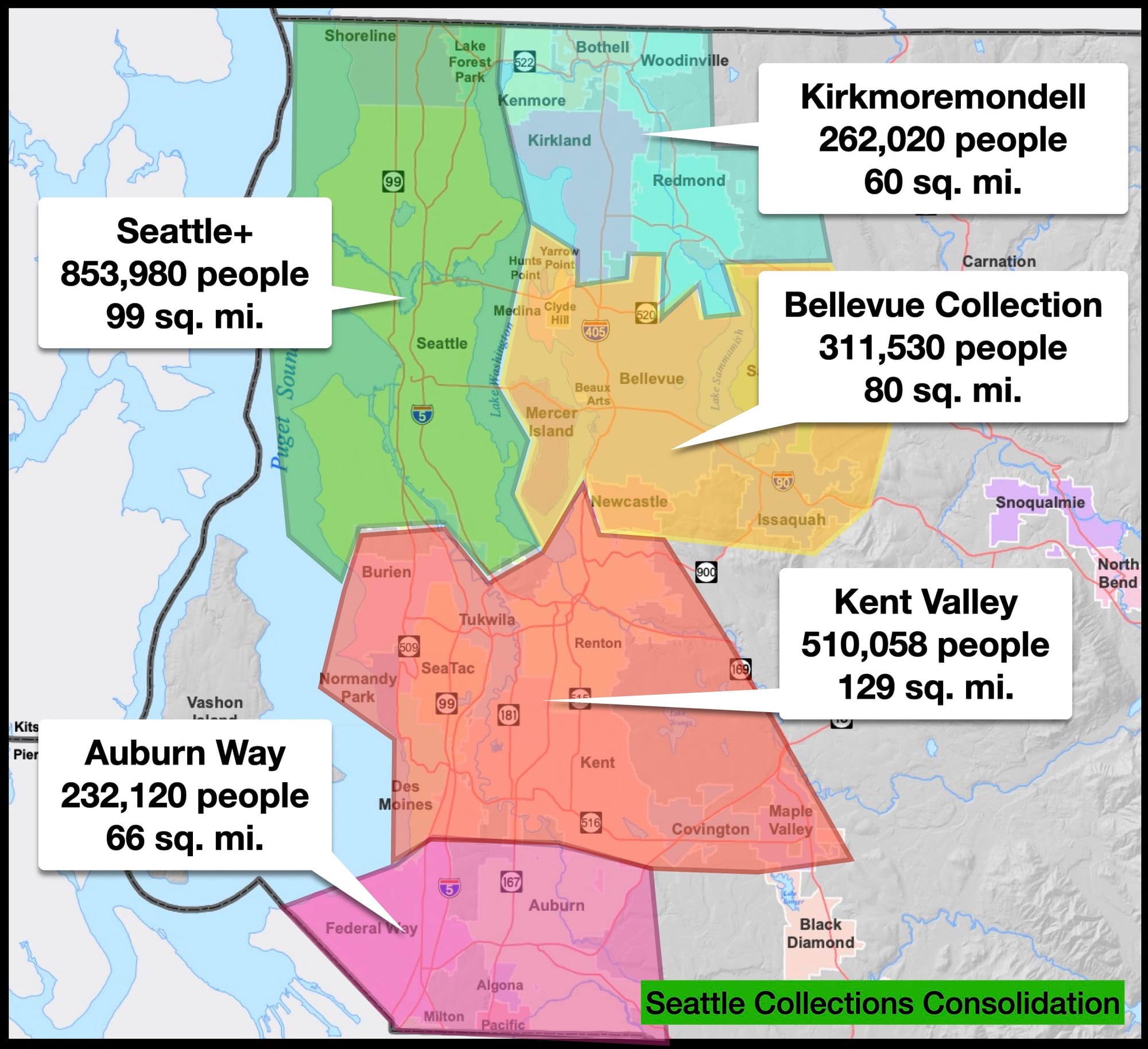 The first potential city consolidation concept is the simplest: three cities around Lake Washington. Merge cities into Mega-Bellevue to the east, an expansive Ultra-Kent to the south, and Seattle+ to the west. Really, such a consolidation accomplishes the biggest goal, wiping out every mini-jurisdiction in an easy swoop. Each of the new cities gets a major piece of infrastructure like the port, the airport, or highways. Each gets a lot of Sound Transit stops. And there is a location of both Dick’s Burgers and Uwajimaya in each new city.