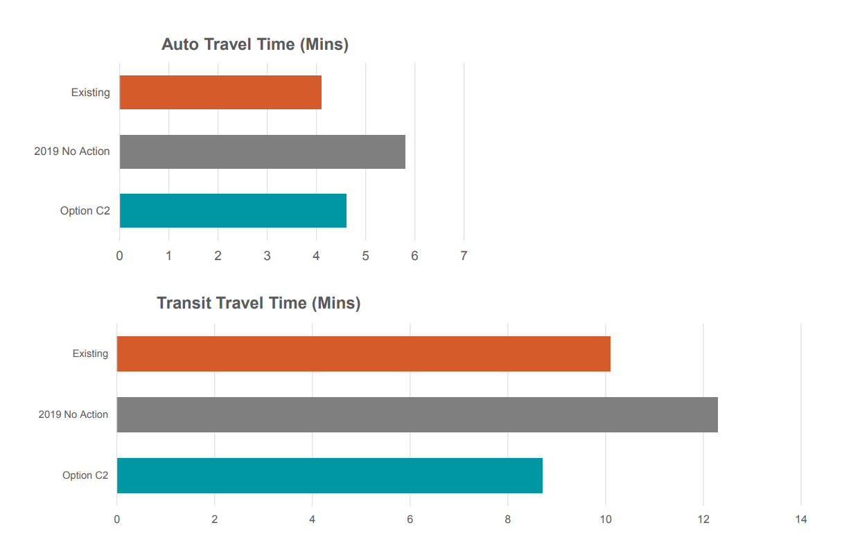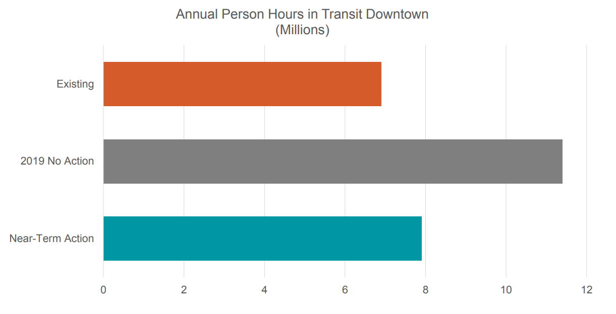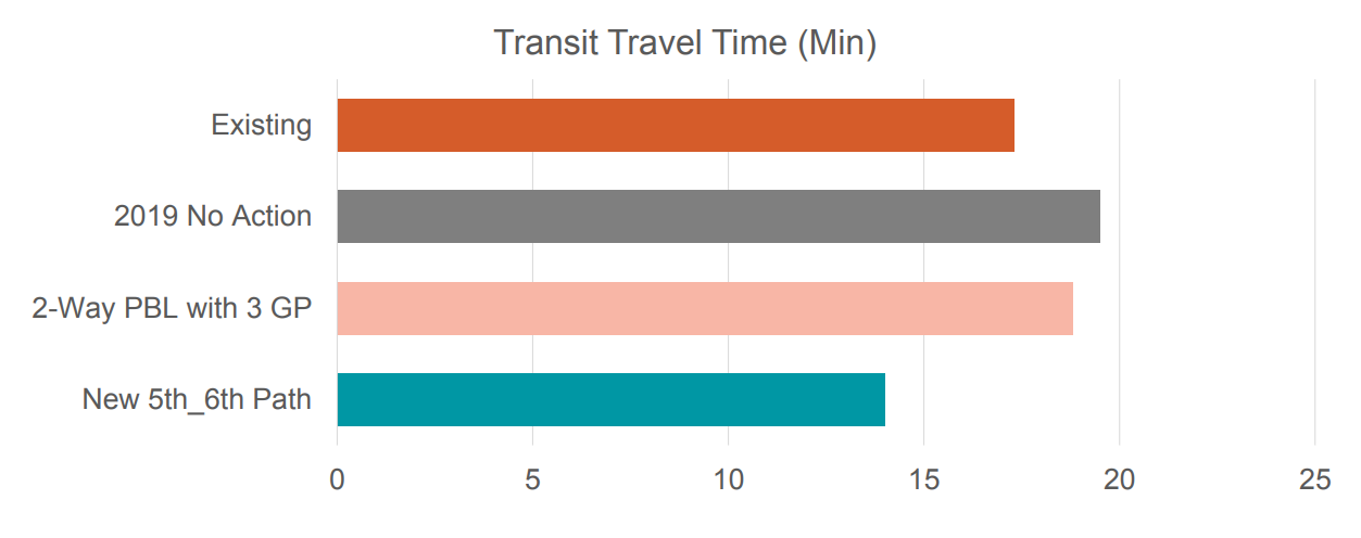 Overall transit time would be dramatically reduced with the 5th/6th Avenue transit pathway: