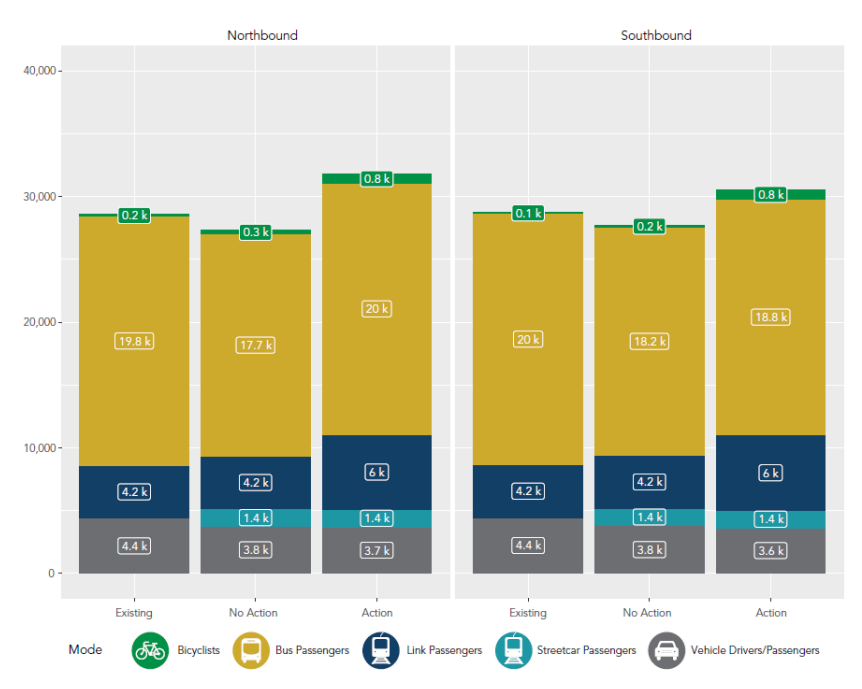 What impact will this have on the amount of people we can move through downtown? A dramatic one. With Link able to handle even more passengers with buses out of the tunnel, northbound buses and Link will be able to move 26,000 people per hour northbound, 2,000 more than the current baseline, not even including the number of people who will be moved on a new streetcar line. So much for the period of “maximum constraint”. More like the period of maximum opportunity, if we don’t let it slip by.