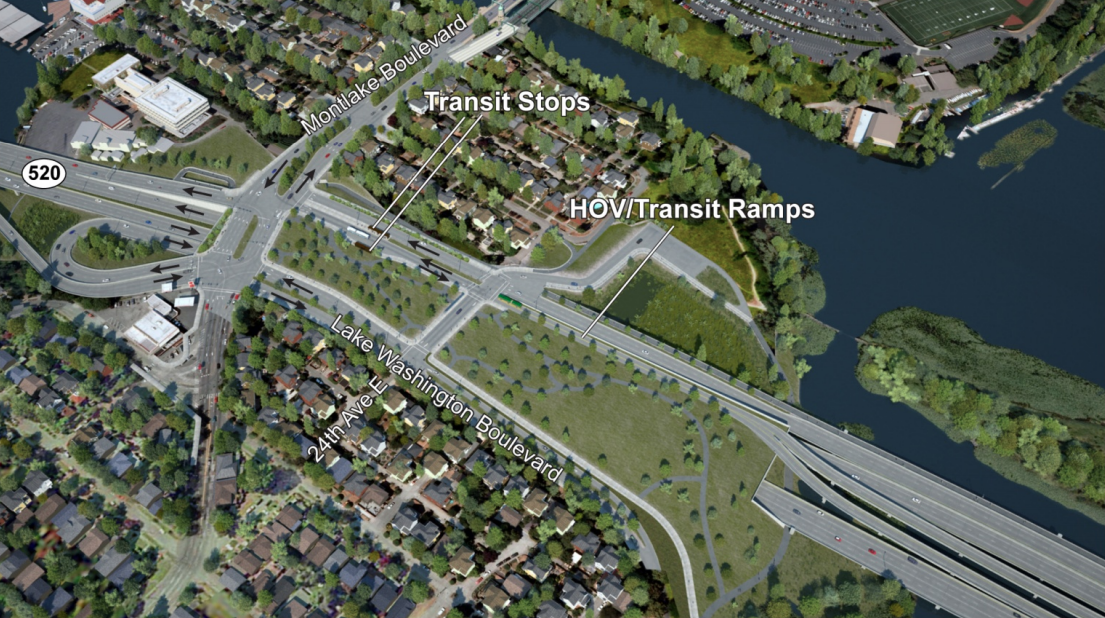 To accommodate all of the turning movements directly over 520, the southbound bus stop along Montlake will end up down at Roanoke Street in contrast to the direct connection to 520 buses that will be available to northbound riders.