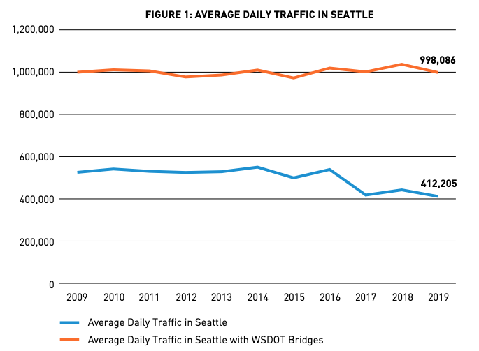 The EIS cites a 2006 report from the Puget Sound Regional Council that “the region” would “need to accommodate close to 40 percent more traffic” by 2030, a fact that only seems relevant in retrospect for how wrong it now appears to be, at least in Seattle. Average daily traffic volumes in the city have been almost completely flat since that report was put out, even declining a bit when the biggest sources of traffic, the state-controlled bridges like SR-520, were not included in the yearly counts, as shown below.