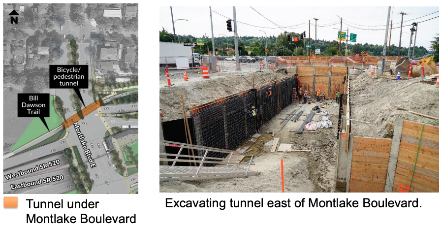 Another part of the project happening right now is excavation work to create a tunnel under Montlake Boulevard just north of 520 that will enable the Bill Dawson Trail, which connects to Montlake and enables people walking and biking to avoid most of the 520 ramps, to eventually connect directly with the Montlake lid and the shared-use path across the lake.