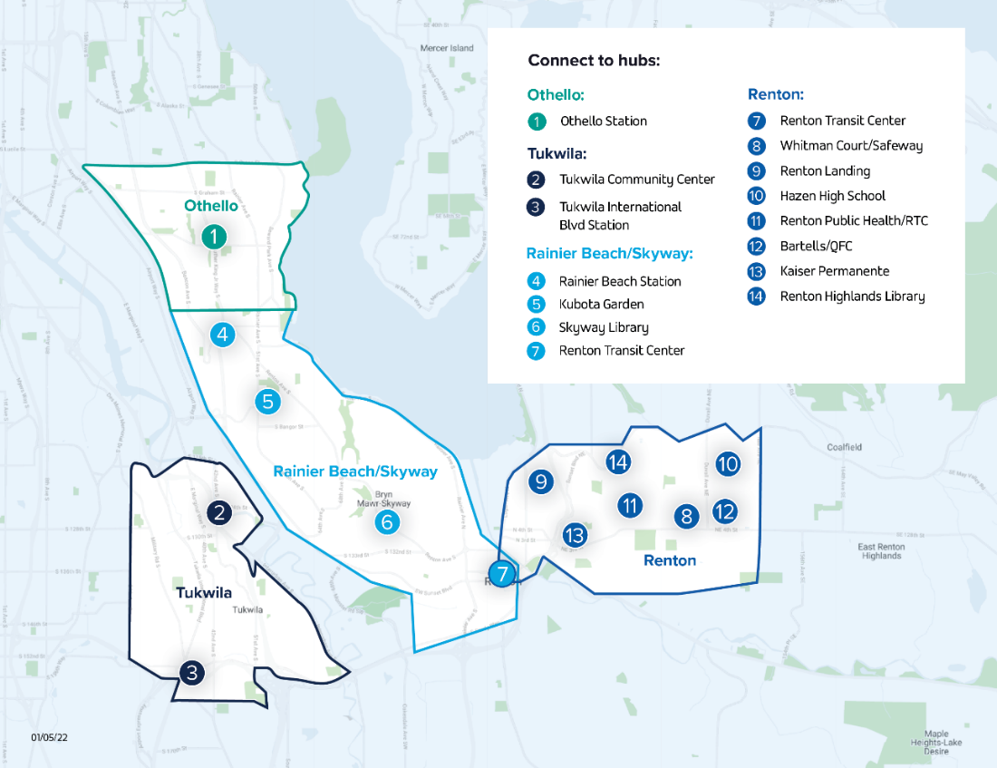 Via to Transit requires that riders either start or end a trip at designated hubs within a service area as part of their journeys. With the service expansion, riders can now pick Hazen High School, Renton Landing, King County Public Health/Renton Technical College, and Whitman Court/Safeway as part of their trips.