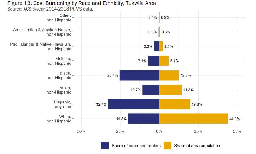 The report notes that the city of Tukwila — where 66% of the population are people of color and about half of residents earn less than 50% of average median income (AMI) — is expected to grow from 20,000 residents today to nearly 30,000 by 2040. The plan sets a goal of building 4,200 new homes in 20 years.