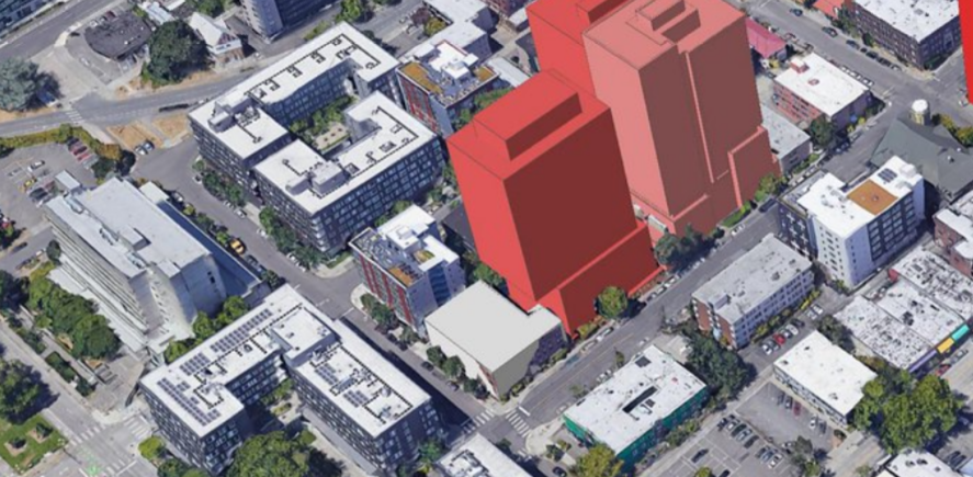 Several parking lots and lowrise buildings in the core of the U District all likely to soon be redeveloped as highrises. For example, developer Barrientos Ryan is proposing to build a 24-story apartment building with 227 homes where a Qdoba and Washington Federal bank branch now stands. The 34-story proposal, meanwhile, would replace a parking lot. While John Fox and his displacement coalition misleadingly stirred up concerns that MHA would tear down more affordable homes than it replaces, nobody is living at a parking lot or a one-story bank. Below are the proposed towers next to what they would replace.