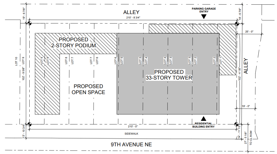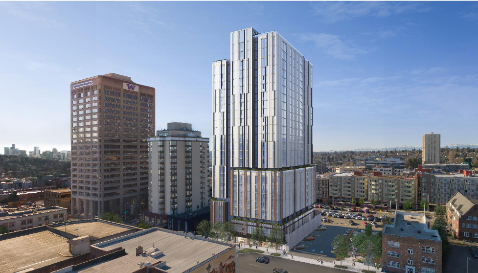 Eight other towers of at least 20 stories are planned for the U District and have progressed to various stages of the design review process. A plan for twin student housing above a new University Temple church will have early design review on October 7th. A proposal for a 34-story tower was announced last week as the developer (Blume Co. Real Estate) tapped VIA Architecture and submitted a site plan for 350 apartments. It’s the first of this new wave to crack 30 stories.