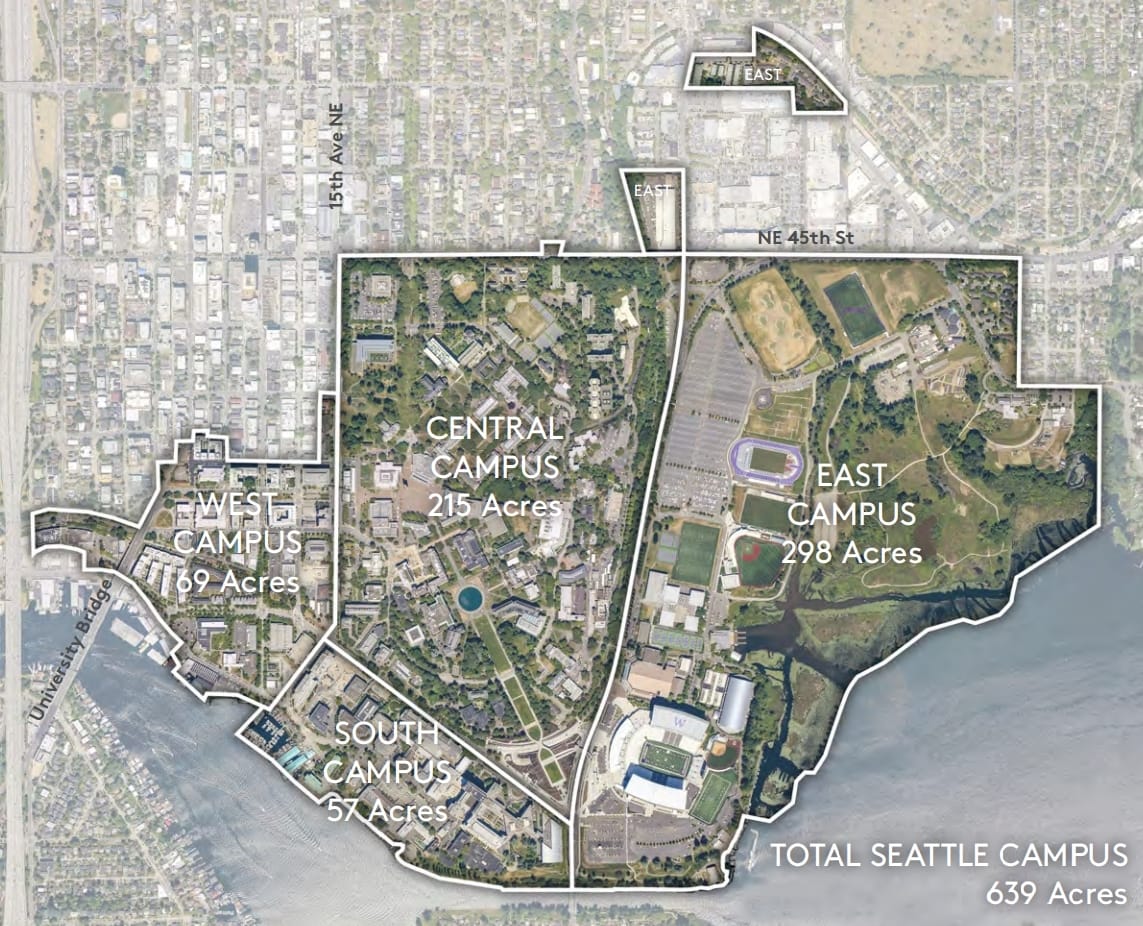 With highrises emerging from the University District, neighboring University of Washington (UW) is also preparing to join in on the developing skyline. Of the four divisions that the University of Washington uses to geographically partition its large footprint, West Campus is slated for the most interesting and taller changes. This is partly due to its more liberal zoning, but also its closeness with the rest of the city. The separation by 15th Ave NE with the rest of the campus often makes this part of campus feel more like the University District and the height limits are more akin, too.