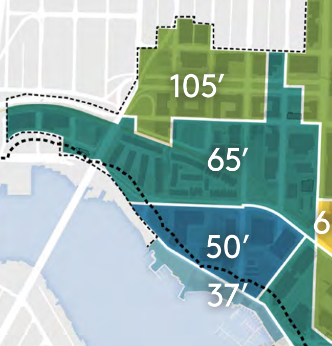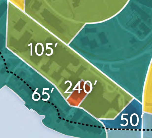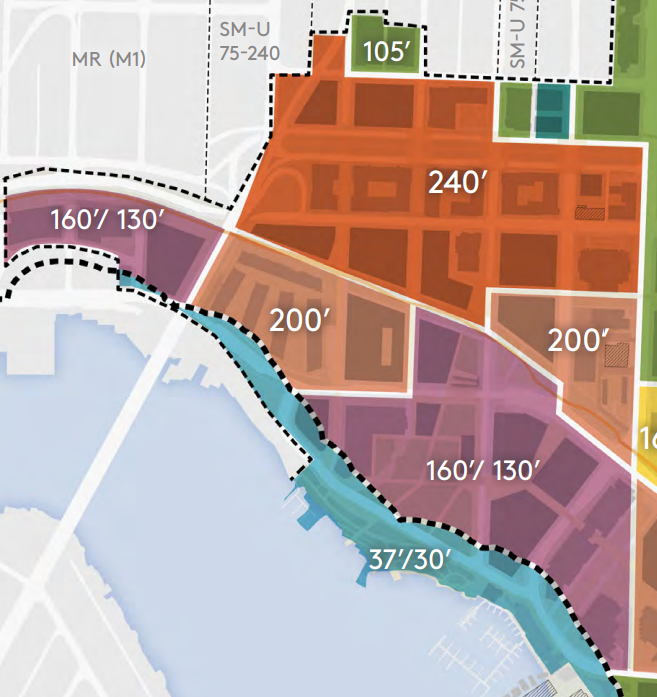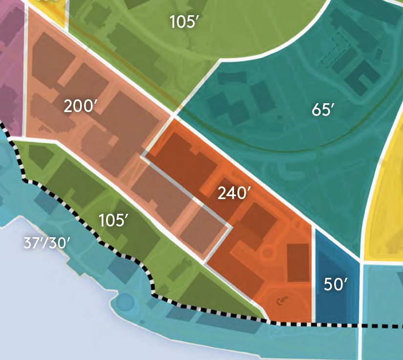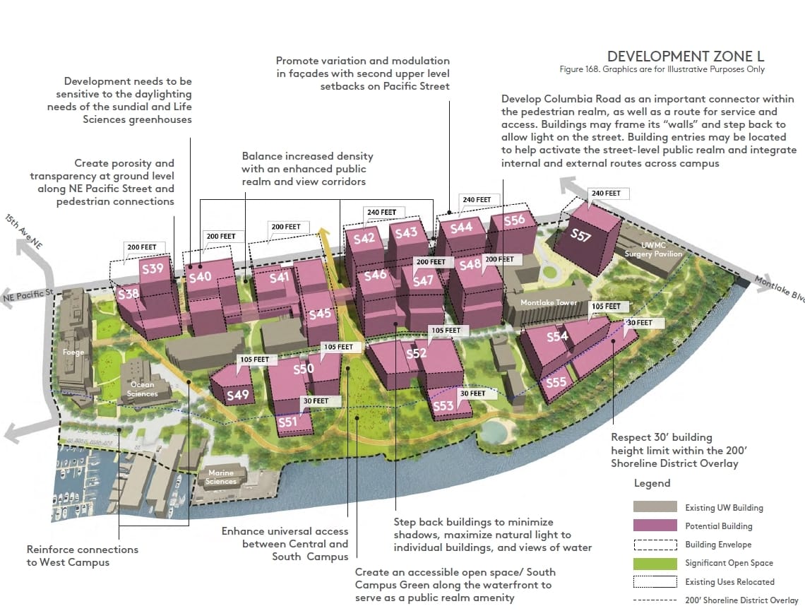 The highrises won’t be the only draw of West Campus, a combined 7.5 acres of green open space is planned to be an anchor of this part of campus in the Longer-Term Vision. This space would be made up of the existing Fritz Hedges Waterway Park (Portage Bay Park) and the Belvedere area, and a proposed West Campus Green and Plaza. The West Campus Green would expand the small open space southeast of the Fishery Sciences building by replacing the John M. Wallace Hall, Marine Studies building, and Fisheries Teaching Research Center. The Plaza would replace some of Stevens Court. Proposed W31 and W32 buildings on the West Campus Green would shirk their 160 feet height limits and instead create small two-story buildings to activate the green space with park amenities and destinations.South CampusSouth Campus also saw significant upzoning in the 2019 plan, matching most of the height limits in West Campus. The smallest sector of the Seattle Campus is already a relatively dense development of midrises, so redevelopment into highrises yields less new square footage. This dynamic makes it so that potential South Campus developments only consume 1.35 million new maximum development or only 23% of the UW’s six million new maximum development limit in the CMP.The full growth capacity of the sector identified in the CMP is 2.2 million square feet of new development, so the UW is only looking to add 61% of envisioned new square footage to South Campus during the current CMP. Assuming that they’re not looking to demolish newer buildings, the site for a potential highrise (W40) is currently the site of the construction of the new four-story Health Sciences Education building. This building was in planning as the 2019 CMP was being completed, so the long-term vision of South Campus may be in the works for a fair number of decades.South Campus may feature nine highrises eventually, with 20 development sites in total as a part of the sector’s long-term plan. Similar to West Campus, new open green space is planned with a South Campus Green that would connect Central Campus with the waterfront. This sector’s plans are less ambitious for the green space, but conditions are different here with the existing span of green open waterfront space.Planning for UW’s futureThe 2003 CMP’s legacy is largely marked by the redevelopment and new student housing options in West Campus and the northern part of Central Campus. The UW is now largely done with building housing for its students, but it has committed to building 150 affordable housing units for faculty and staff earning less than 60% area median income (AMI), and no fewer than 300 for staff earning less than 80% of AMI. With student housing at the top of the university’s existing space, office, and other uses are now top of mind.With the 2019 CMP’s focus on West Campus and turning that sector into its innovation district, it’s no surprise that office and research labs are among the most uses needed by the UW. By 2028, the UW estimates that they’ll need nearly two million square feet of office space and nearly three quarters of a million of research lab space. Proposed sites like W27 are proposed for academic, mixed use, and industry partnership/manufacturing uses. Meanwhile, South Campus’s proposed buildings are primarily just proposed for academic and mixed uses. New library and study space are needed, with planners projecting the nearly a million more square feet needed by 2028.New green space and stronger pedestrian connections are also a part of the CMP’s overall strategy to reduce emissions and promote space for people. An open space commitment for West, South, and East Campus all require the university to build out respective parts of a continuous waterfront trail before permits can be applied for neighboring sites. These spaces are also important for neighboring U District, which sees benefit from increased nearby green space.Together the U District and the UW are transforming the image of Seattle just above the ship canal. Combining the two jurisdictions, a possible nearly mile-long skyline emerges from NE 50th St all the way down to Portage Bay. When you include South Campus as a tangent of the U District/West Campus cluster, the potential skyline stretches all the way from I-5 to the Montlake Bridge at nearly 1.5 miles long.
