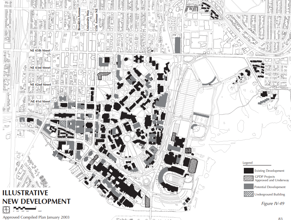 In their approved 2019 Seattle Campus Master Plan (CMP), the UW acknowledged West Campus as their most urban of the four campus sectors. The 2019 plan succeeds the 2003 Campus Master Plan of which there is only 210,000 square feet of new development left out of the three million gross square feet (gsf) approved in 2003. The University identifies nearly 12 million square feet of development capacity in its newest CMP and is now allowed to grow six million square feet over the ten-year span of the master plan — though the CMP will remain in effect until the growth allowance is exhausted. Assuming that the University’s allowance is expended by and updated again in 2029, the UW will be allowed to build more than three times as fast as it did between 2003 and 2019.