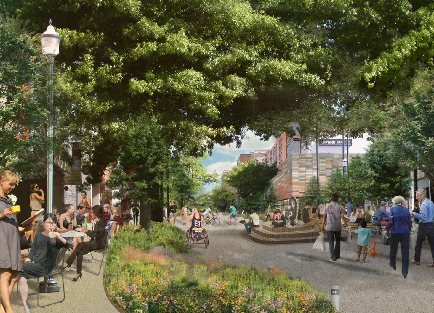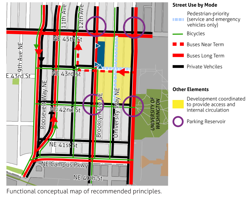 Signs of progress toward making space for pedestrians are already visible in the neighborhood, with the transformation of NE 43rd Street. Once a nondescript two-way street, 43rd now features public seating along both sides of the street with only one-way bus and bike traffic allowed. A one-way bike lane enables people on bikes to head in the contraflow direction. That redesign has turned it from a place people rush to pass through to one where people want to linger and spend time.