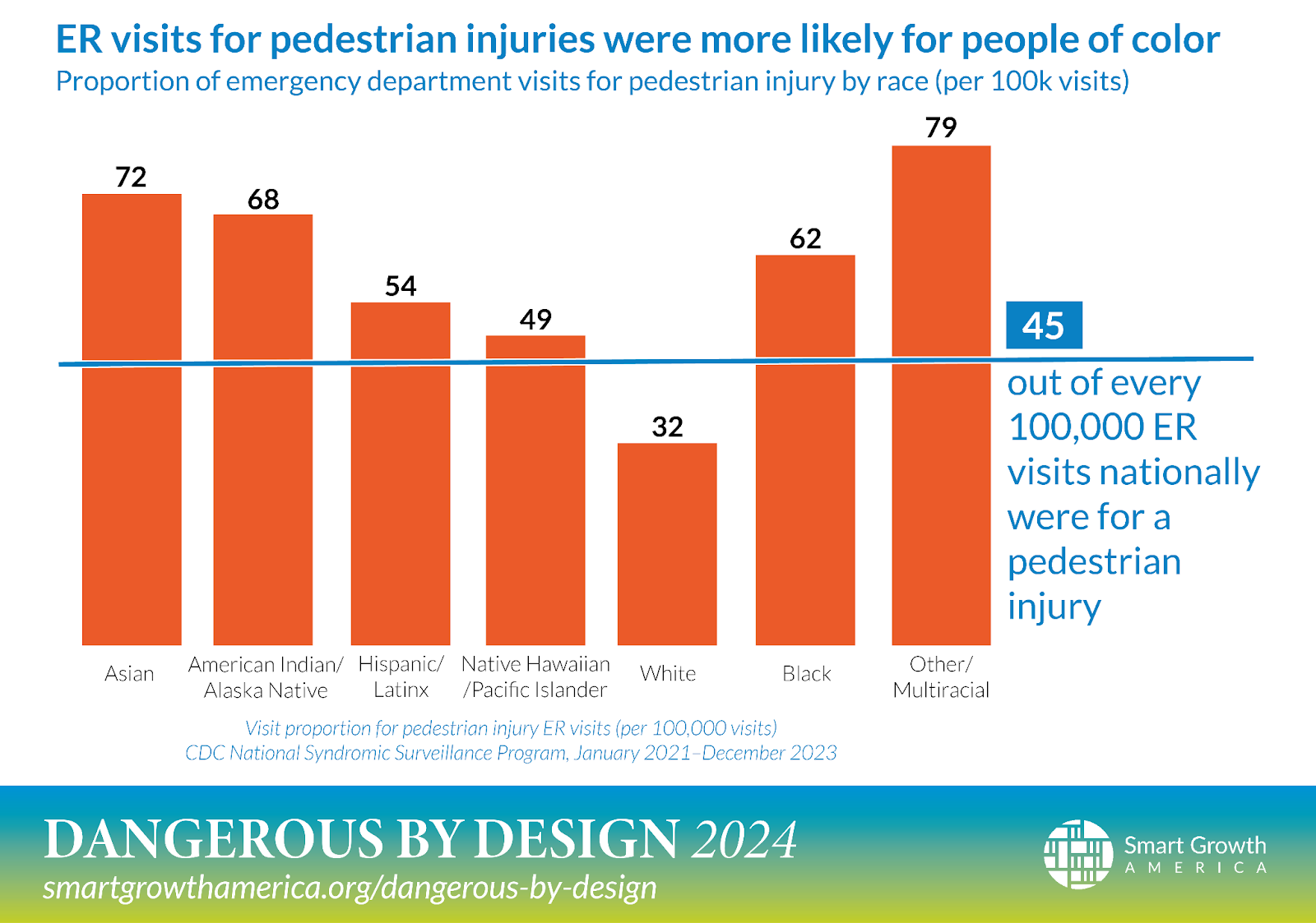 The most dangerous neighborhoods for pedestrians in cities tend to be found in lower income neighborhoods, and state-owned roads, like Aurora Avenue (SR 99) and Rainier Avenue (a decommissioned state road) in Seattle, are disproportionately the site of crashes that injure and kill pedestrians. Dangerous By Design 2024 found that within the 101 largest U.S. metro areas, 66% of all traffic deaths occur on state-owned roads, which are often designed as major thoroughfares with multiple lanes of traffic and high speed limits – even in populated urban centers.