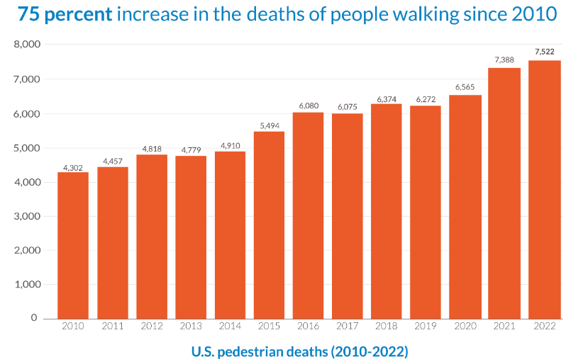 Smart Growth America recently released Dangerous By Design 2024, a national report tallying the number of people killed while walking and ranking the 101 largest U.S. metro areas by their fatality rates. The report paints a grim picture of traffic violence in the U.S. 2022, the most recent year for which complete federal data has been collected, marked a 40-year high for pedestrian deaths in the U.S. – 7,522 people were killed, an increase of 57% in a decade. In 2013, 4,779 pedestrians died, for comparison.