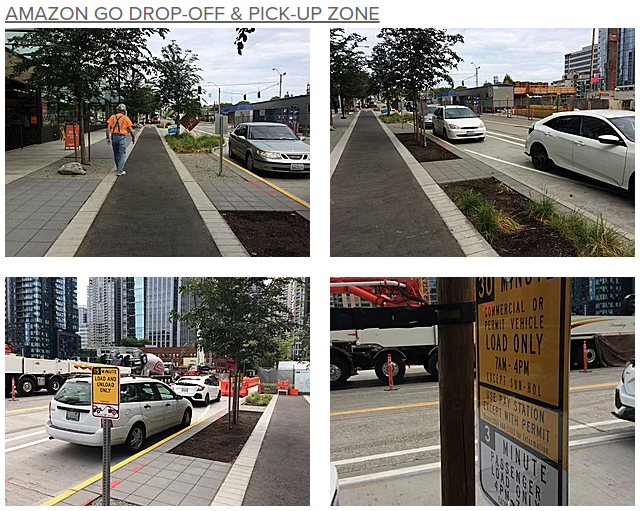 You can see here that Microsoft has a similar design, but nonetheless a design that allows for plenty of vehicles to drop-off and pick-up pedestrians. Signs, painted curbs, and size are pretty similar to Amazon Go’s drop-off and pick-up zones.