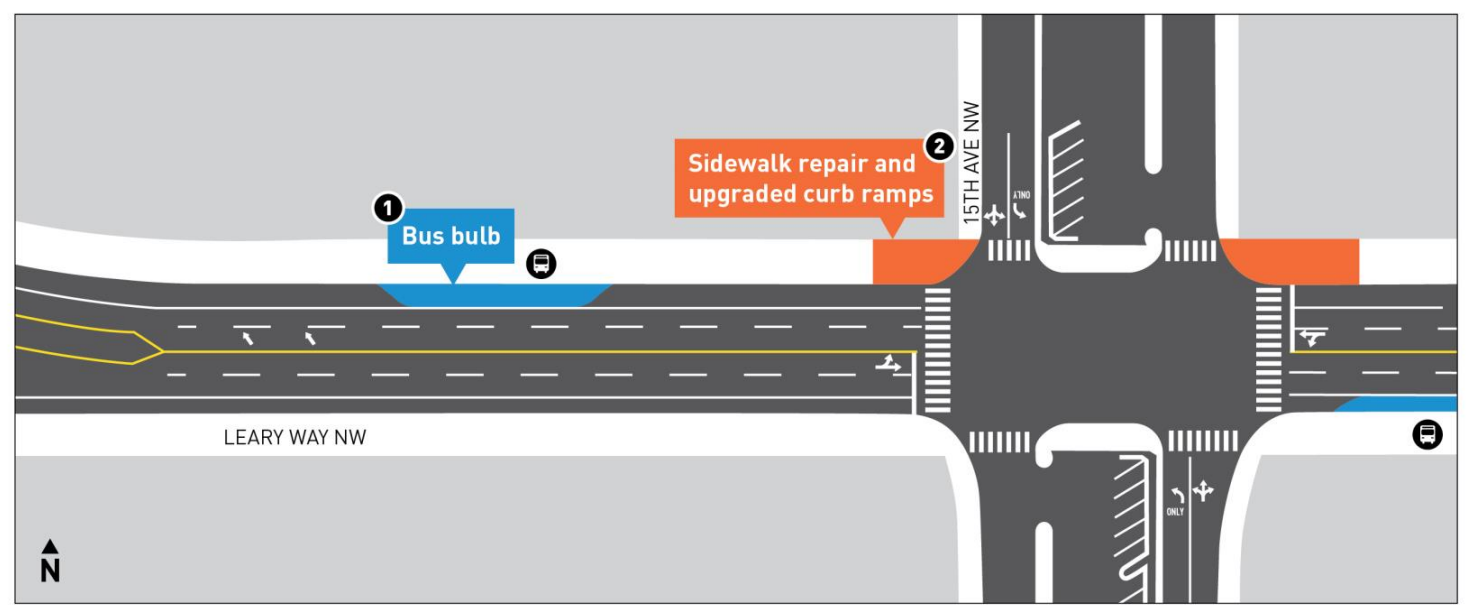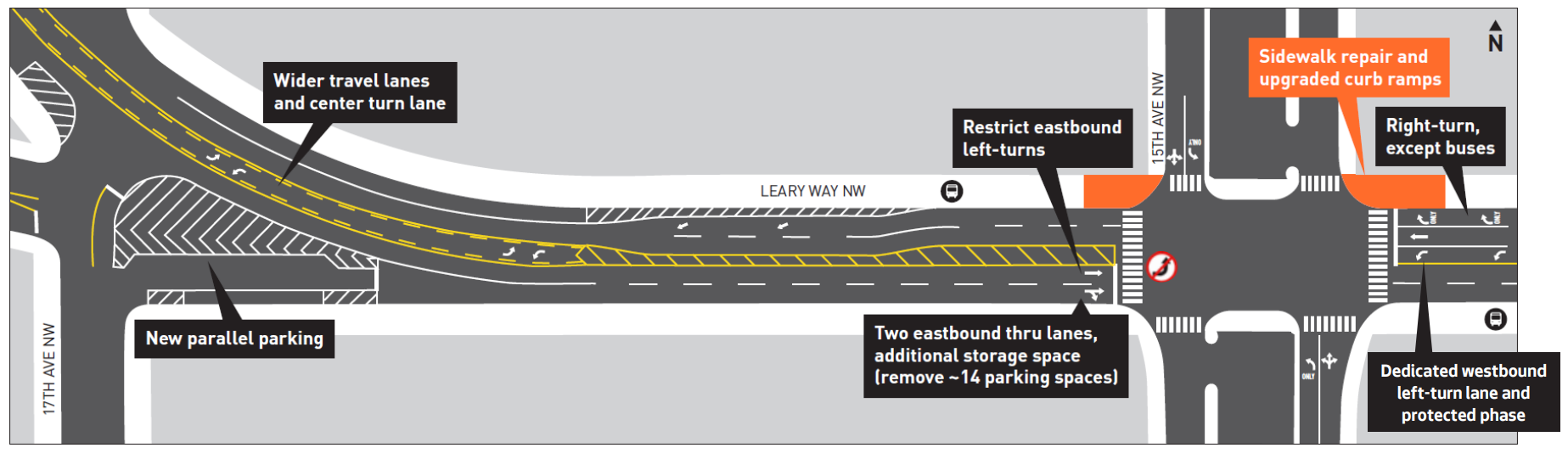 Perhaps the most important change that’s been announced involves the area around Leary Way NW and 15th Avenue NW, the stretch on either side of the Ballard Bridge underpass. Last year, the plan was to rechannel Leary Way west of 15th, removing parking and restricting eastbound left turns from Leary onto 15th. This intersection is one of the worst in the city to navigate on foot, and while the proposed design certainly wouldn’t have made it a pedestrian haven, but would have been a step in the right direction.