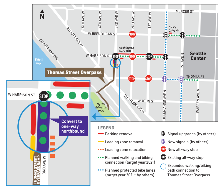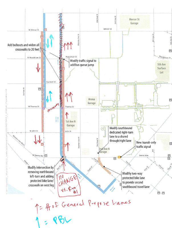 At Denny Way, a new pedestrian and bicycle crossing will be added along the west side of the intersection, where a signalized crossing currently doesn’t exist and signs prohibit crossing now. From there the bike lane will run along 1st Ave N’s west side for two blocks to Thomas Street, kitty-corner from the arena, but on Thomas Street it takes a jog over one block to Queen Anne Ave N.