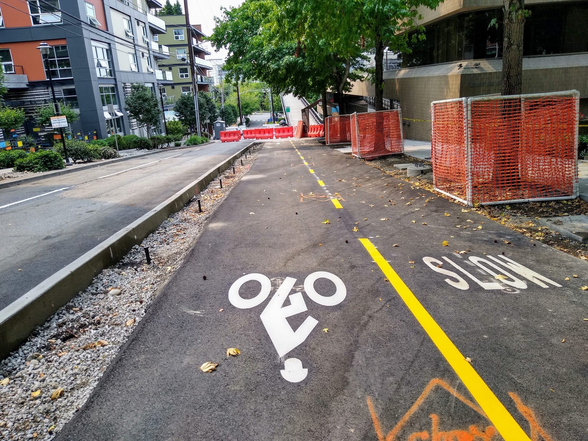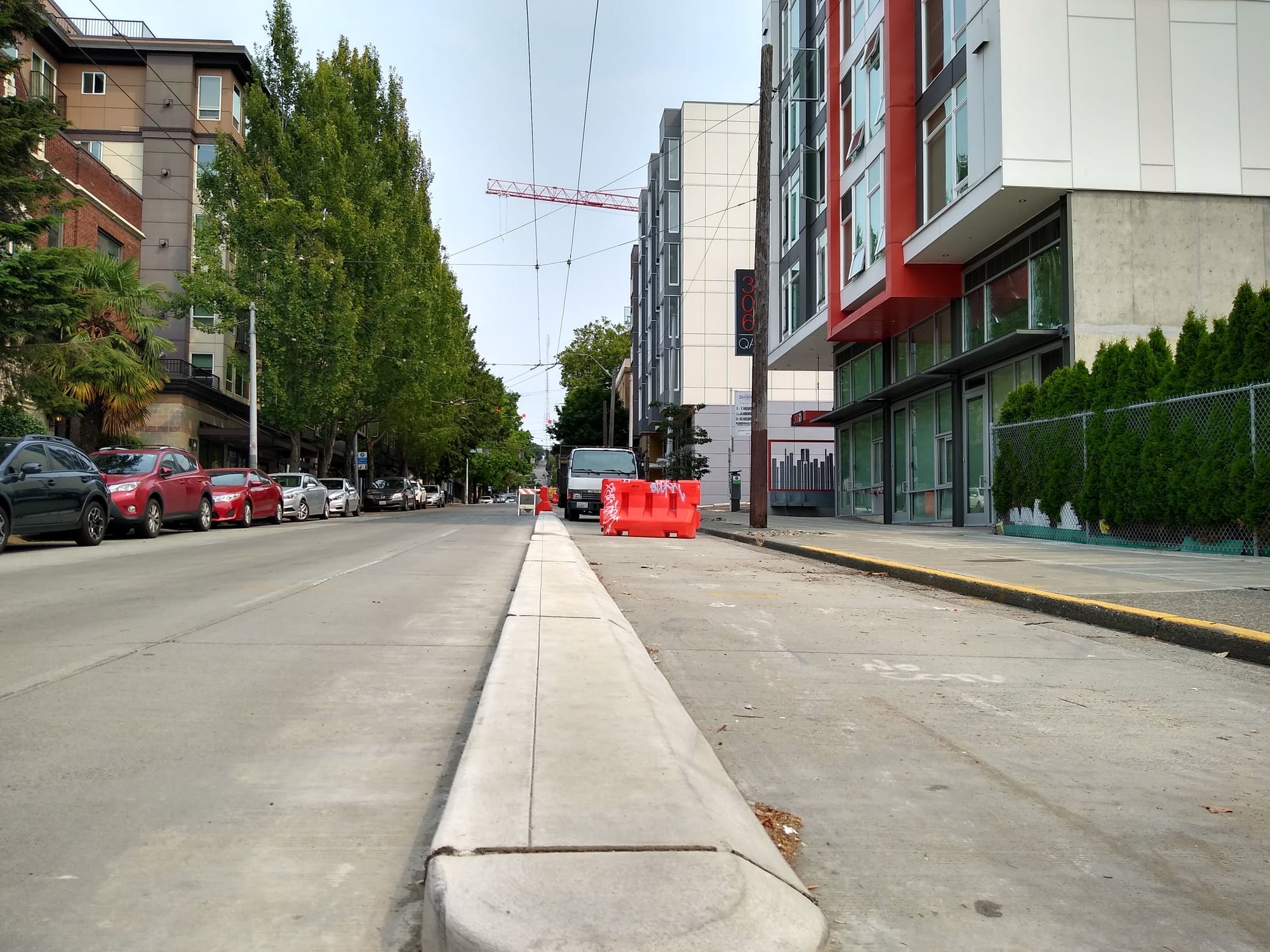 Big upgrades are also taking shape to the connection to the Elliott Bay Trail via the John Coney bridge at Harrison Street and 3rd Ave W. Once complete, the street will have a two-way protected bike lane for the half block between the bridge and Harrison Street. New sidewalks have replaced the damaged old ones for people who don’t feel comfortable in a bike lane.