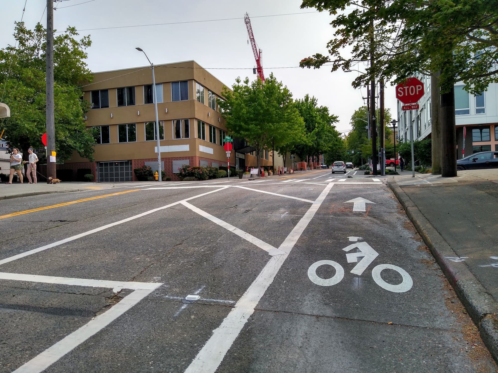East-west improvements in Uptown are already in place along Harrison Street connecting to the Queen Anne Ave N protected bike lanes, but just in the uphill direction. Downhill the traffic lane has been narrowed, with no parking along that side of the street, with new all-way stop signs hopefully reducing vehicle speeds along the corridor.