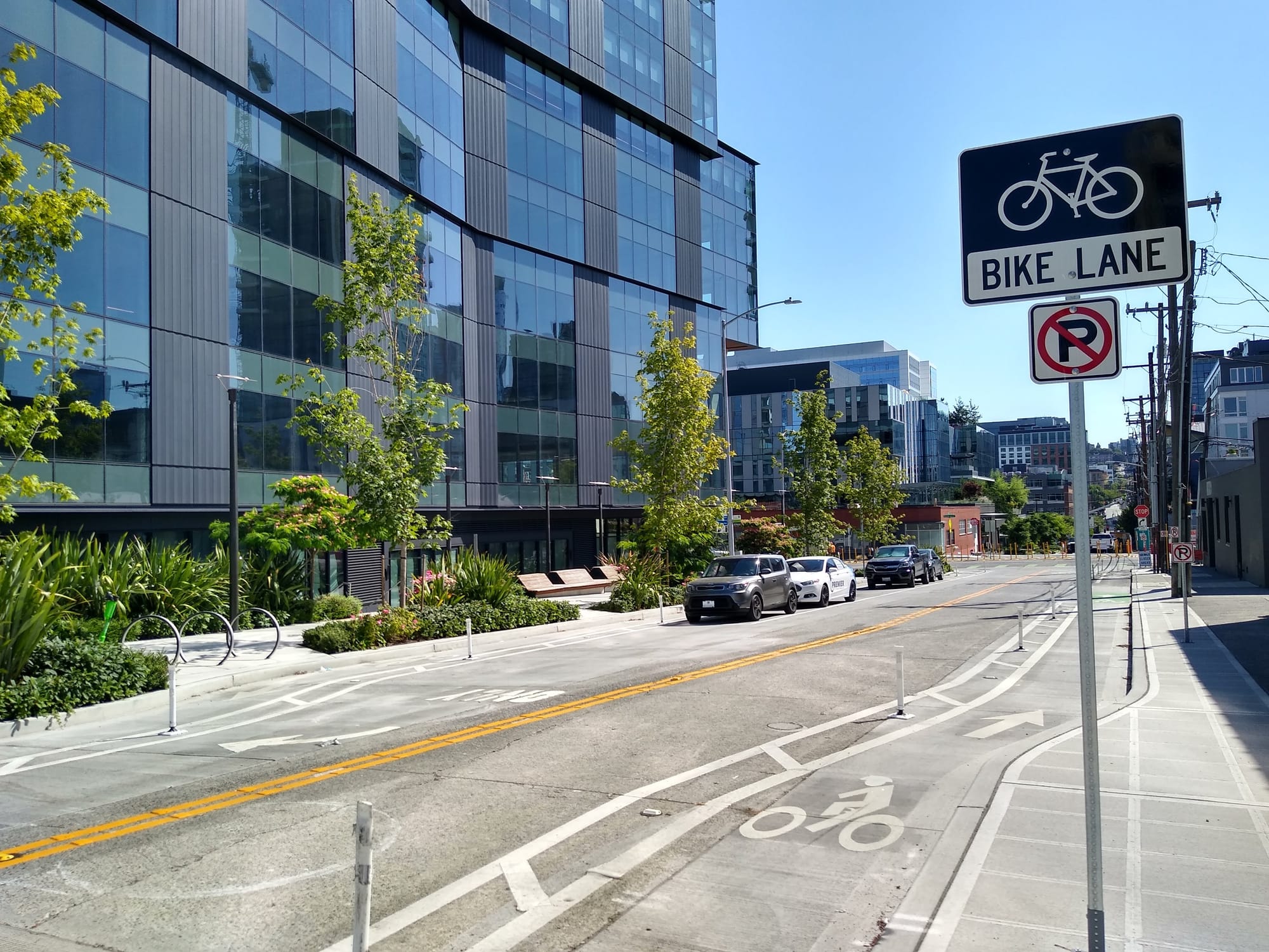 On the east side of Seattle Center, people riding bikes from Dexter Ave N or 9th Ave N might not have noticed new protected bike lanes that went in last year along Thomas Street around the time that the Washington State Department of Transportation was wrapping up work on the massive-for-a-city-street 7th Ave N. Some gaps remain along Thomas, as the corridor was slated to get further upgrades as part of the “Thomas Street Redefined” project. That project actually involved a planned closure of Thomas Street to vehicle traffic immediately east of Seattle Center at 5th Ave N in early 2020 but that never happened, with a new timeline unclear.