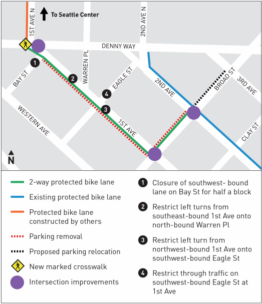 Work is currently underway to extend the 2nd Avenue protected bike lane into Uptown. The current northern terminus of that bike lane at Denny Way will be adjusted, routing people on bikes onto the sidewalk area so that two southbound lanes of 2nd Avenue can cross Denny Way at a time. Instead, the extension of the two-way protected bike lane will be installed along Broad Street and 1st Avenue.