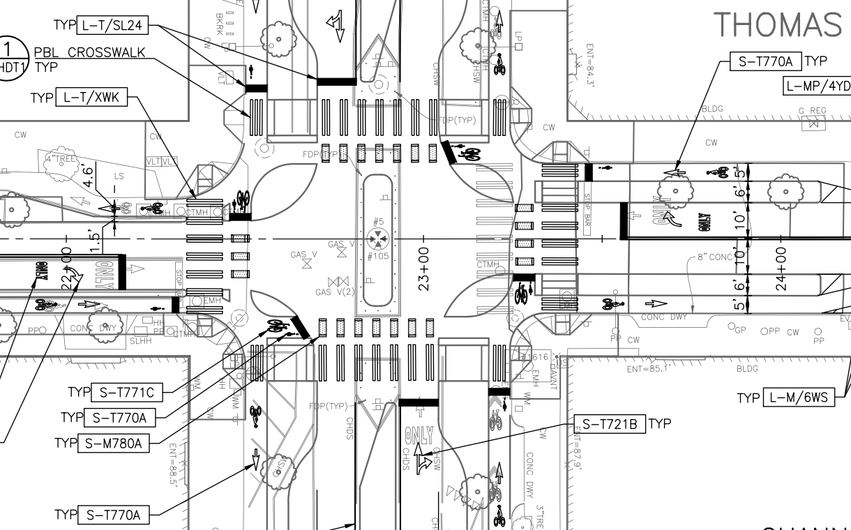 Among other upgrades, Thomas Street Redefined includes the installation of Seattle’s first protected intersection at Dexter Ave N, a design implemented in many other cities in which all directions of bike and pedestrian traffic are protected from turning vehicles by physical barriers through most of the intersection. The plans for that are currently at the 30% design level and are shown below.