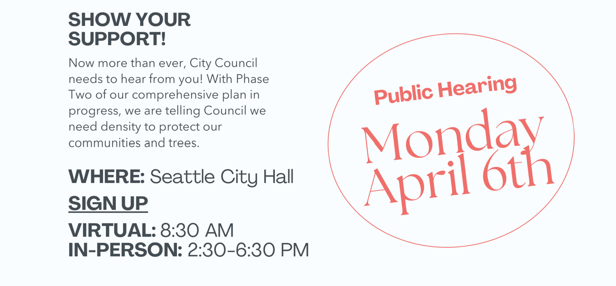 What: Rally in support of housing in Phase 2 of the Seattle Comprehensive Plan. After the rally, we will be signing up to give public comment in person. Online public comment begins earlier in the day, and in-person public comment sign-up is open until 6:30 pm.