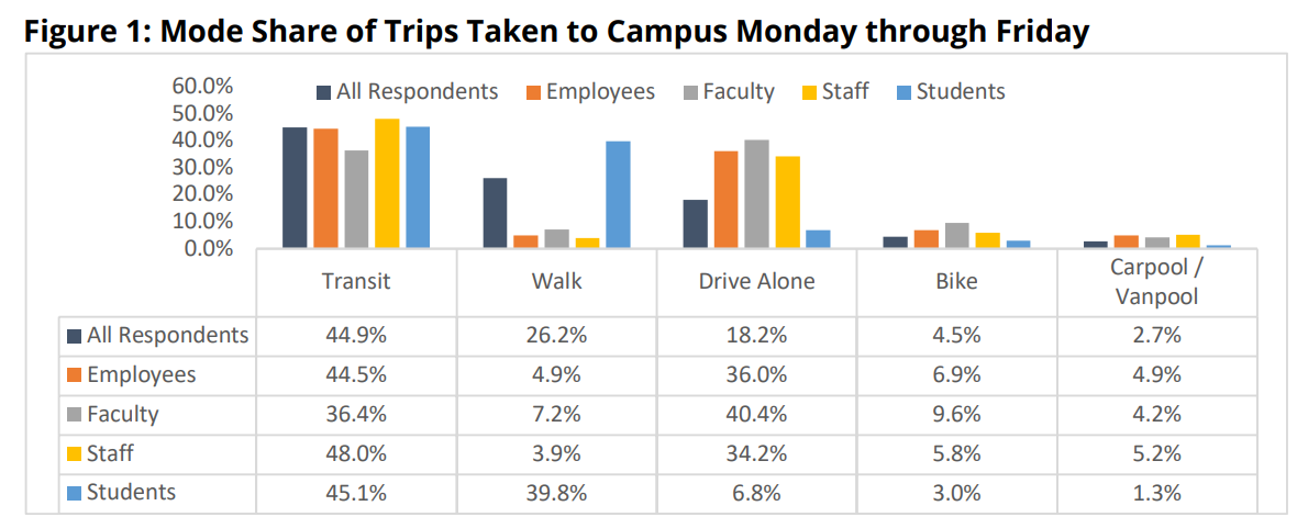 In its 2023 annual report, UW reported a 13% drive alone rate for 2022 across its whole population, with walking and transit the top two ways people get to campus. About a quarter of faculty and staff drive alone, but just 8% of students do, bringing down the campus-wide average. One big change in the pandemic era: 34% of UW employees are now telecommuting which has helped decrease driving rates and student transit rates are recovering after an initial pandemic dip.