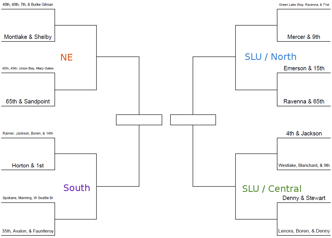 We now have a bracket and a real competition! There are 16 reader-nominated intersections lined up for you to choose from in this week’s worst intersection survey.